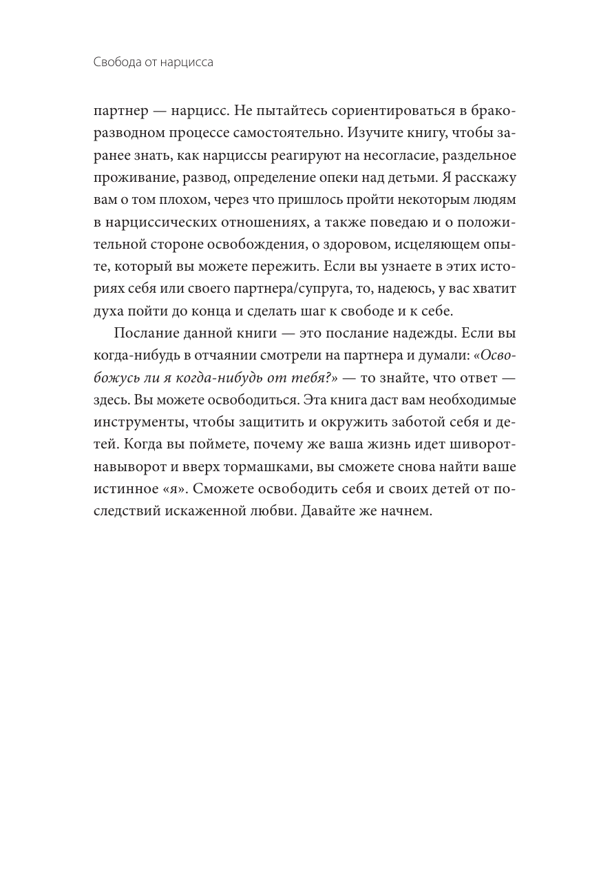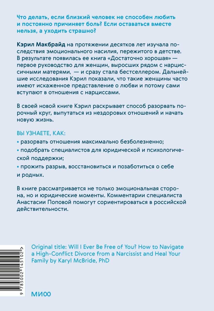 Что делать, когда с когда-то любимым человеком больше невозможно общаться и строить будущее? Если единственный выход - уйти - пугает своими последствиями и сложностью, это практическое руководство для вас. Его написала всемирно известная психотерапевт Кэрил Макбрайд, автор бестселлера "Достаточно хорошая". Книга "Свобода от нарцисса" поможет вам выйти из отношений с нарциссичным партнером, который причиняет боль вам и вашей семье. Вы узнаете, как: разорвать отношения максимально безболезненно, подобрать специалистов, которые в этом помогут, взаимодействовать с судебной системой прожить разрыв, восстановиться и позаботиться о себе и оставшейся семье. Четкие практические советы автора помогут пройти путь от начала и до конца, а комментарии специалиста Анастасии Поповой - сориентироваться в российской действительности.