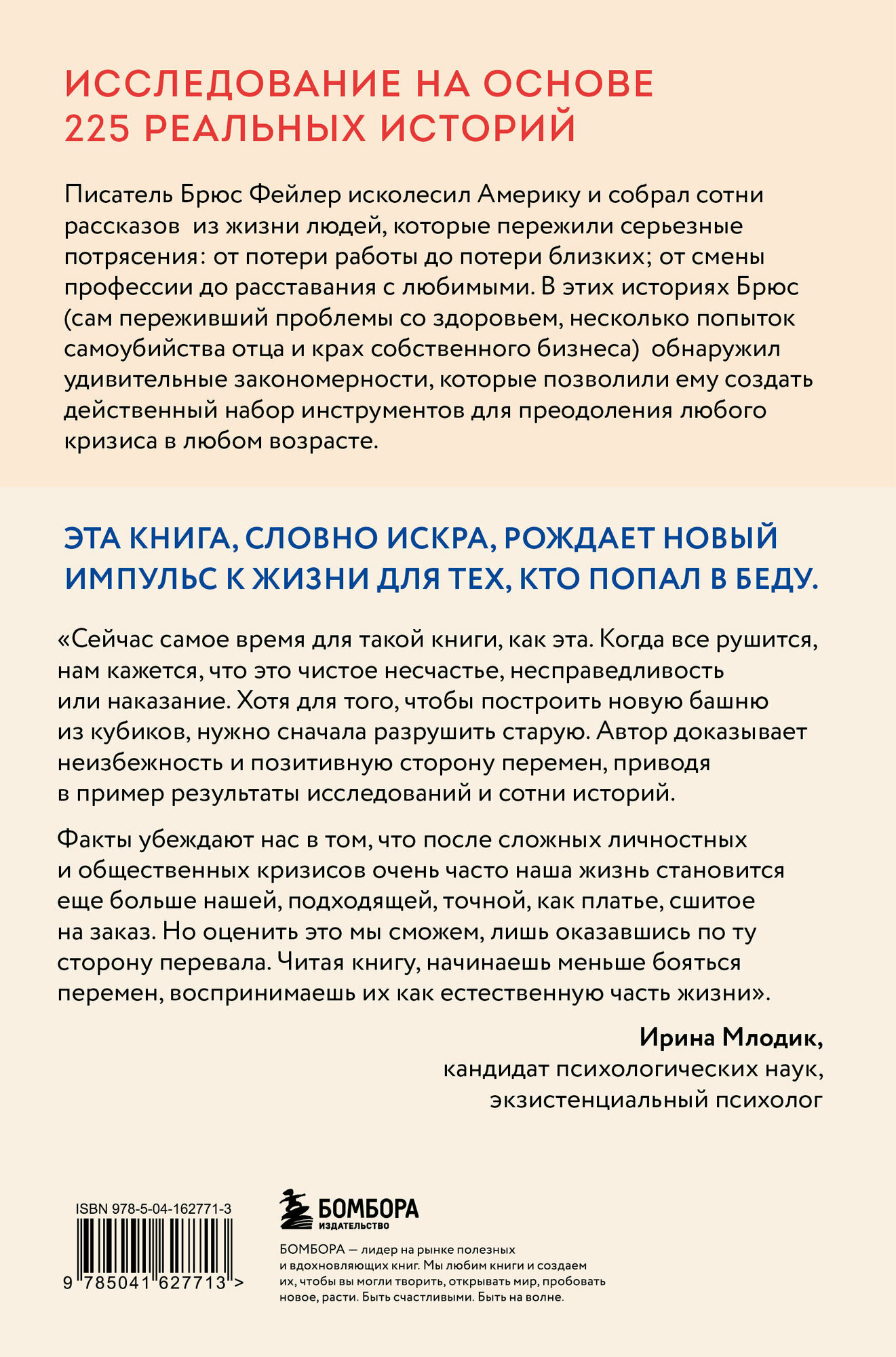 Писатель Брюс Фейлер исколесил всю Америку и собрал сотни историй из жизни людей, которые пережили серьезные потрясения: от потери работы до потери близких; от смены профессии до расставания с любимыми. В этих историях Брюс (сам переживший проблемы со здоровьем, несколько попыток самоубийства отца и крах собственного бизнеса) обнаружил удивительные закономерности, которые позволили ему создать действенный набор инструментов для преодоления любого кризиса в любом возрасте. Эта книга, словно искра, рождает новый импульс к жизни для тех, кто попал в беду.