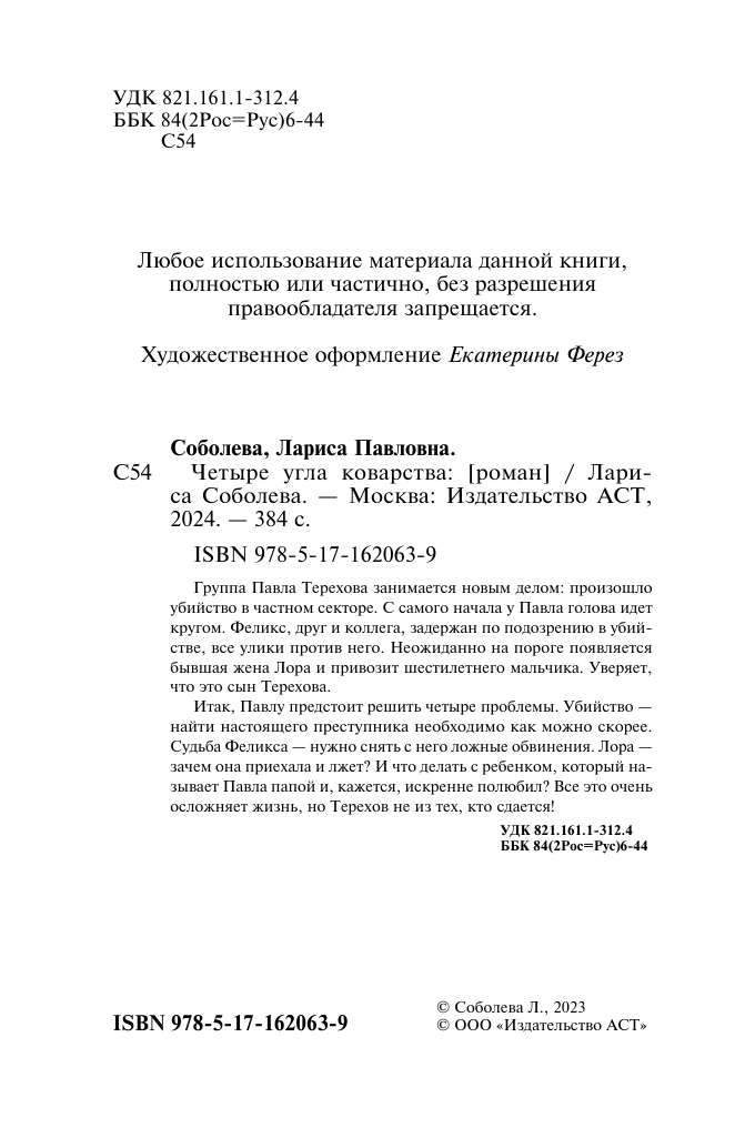 Книга: Четыре угла коварства (Лариса Павловна Соболева); АСТ, 2024