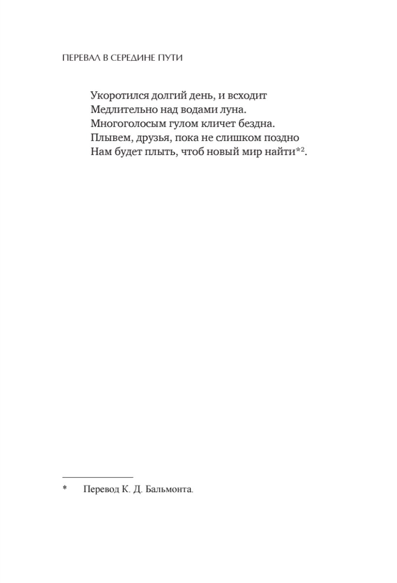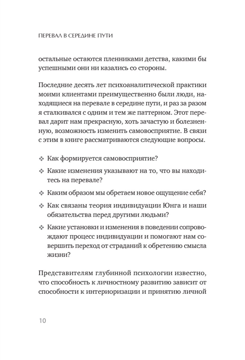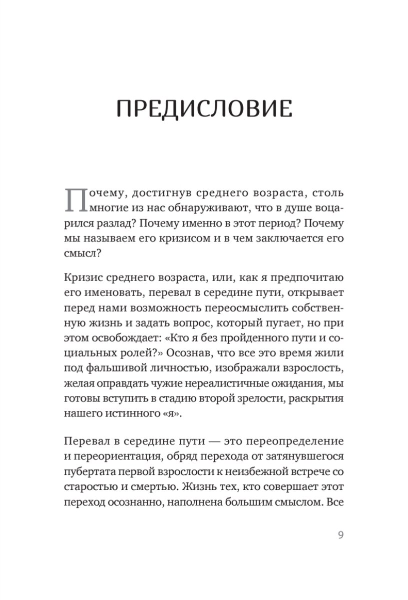 Почему, достигнув среднего возраста, многие из нас обнаруживают, что в душе воцарился разлад? Почему именно в этот период? Почему мы называем его кризисом? И в чем заключается его смысл? Кризис среднего возраста, или, как называет его автор, перевал в середине пути, открывает перед нами возможность переосмыслить собственную жизнь и задать вопрос, который пугает и освобождает одновременно: «Кто я такой, если не брать в расчет мою биографию и социальные роли? » Перевал в середине пути открывает поразительную, хотя и болезненную возможность пересмотра представлений о самом себе. Тот, кто сможет это сделать, превратит свою жизнь в более осмысленную и откроет новые для себя возможности. В формате PDF A4 сохранен издательский дизайн.