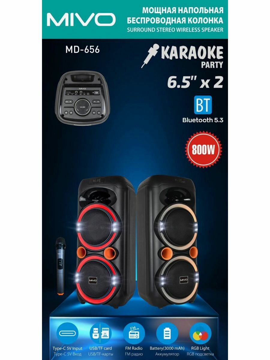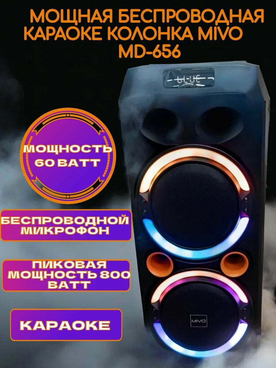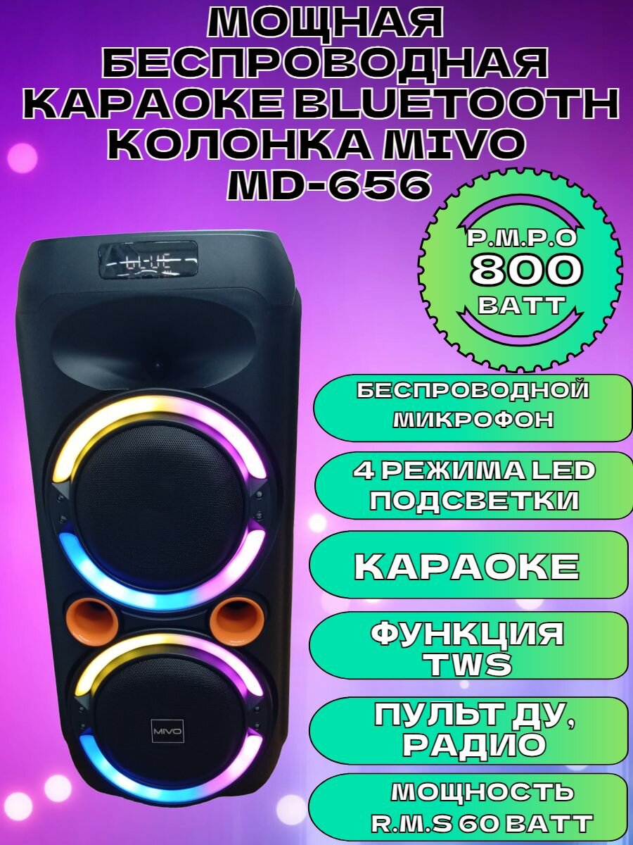 Mivo - это мощная bluetooth колонка, которая обладает уникальным дизайном с 9-ю режимами RGB подсветки, данная колонка способна выдавать звук пиковой мощностью в 800 Вт! Беспроводная колонка оснащена 2мя сабвуферами и твиттером с мощнейшим басом, но в тоже время кристально чистыми и прозрачными средними и высокими частотами. Портативная колонка отлично подойдёт для проведения праздников как дома, так и на улице. Громкий, мощный, насыщенный и кристально чистый звук, наличие яркой и уникальной светомузыки + цифрового микрофона для караоке в комплекте - всё что нужно для успешного проведения праздника!