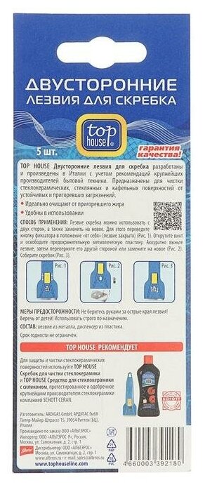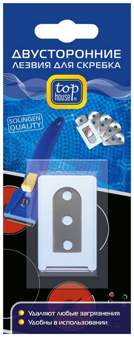 | Описание | Двусторонние лезвия Top House для скребка предназначены для чистки стеклокерамических, стеклянных и кафельных поверхностей от устойчивых и пригоревших загрязнений. |
