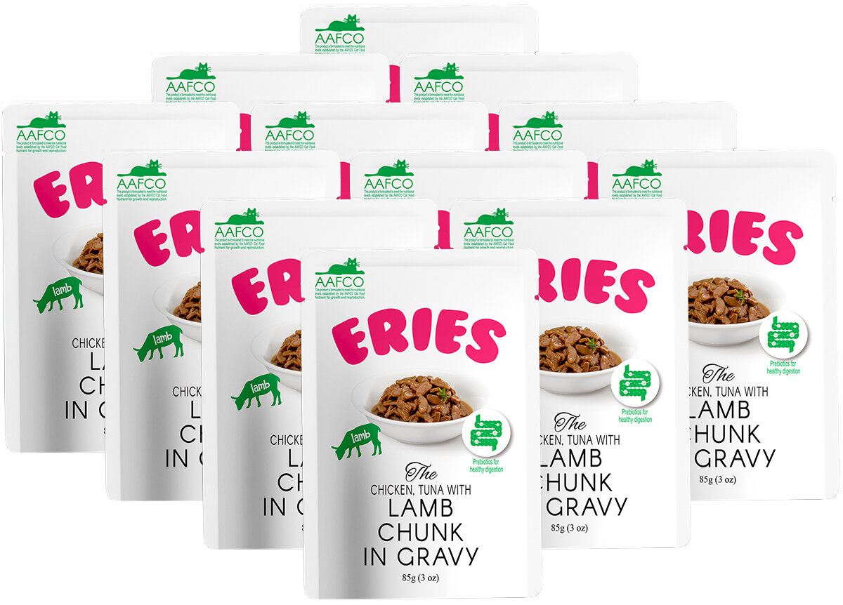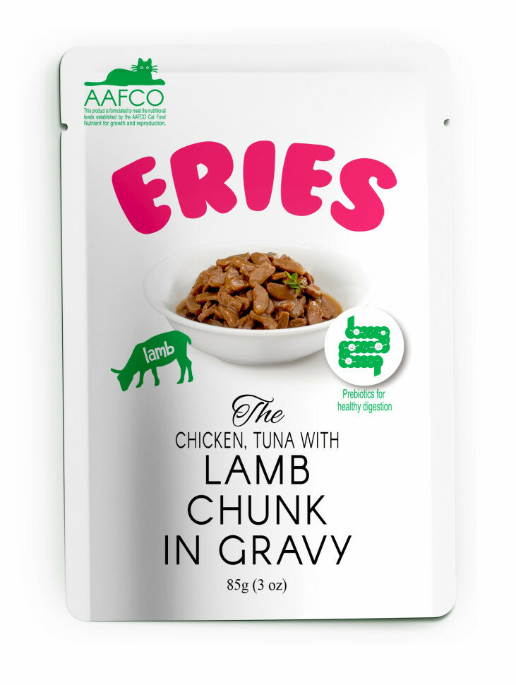 Полнорационный корм для кошек. Нежные кусочки с ягненком, тунцом и курицей в аппетитном соусе. Содержит пребиотики для улучшения пищеварения. Паучи Pettric ERIES - 4 причины: 1. Суперпоедаемость. Подойдет даже привередливым кошкам. 2. Полнорационное питание соответствует стандартам AAFCO. 3. Три пребиотика: инулин, FOS и MOS, которые улучшают пищеварение. Пищеварительная система кошек предназначена для переваривания пищи, содержащей животные белки и жиры. Но для правильного пищеварения требуются и растительные волокна, которые содержатся в пребиотиках. • Инулин, фруктоолигосахариды (FOS) и маннанолигосахариды (MOS) идеально подходят кошкам как источник клетчатки и поддерживают баланс микрофлоры. 4. Суперпремиальное качество, подтвержденное сертификатами безопасности. Ингредиенты: курица, красное мясо тунца, пшеничная мука, легкие ягненка, минералы и витамины, гидролизат куриного белка, вкусовая добавка, гуаровая камедь, экстракт юкки, пребиотики (инулин, FOS, MOS), таурин, пищевой краситель, вода. Гарантированный анализ: сырой протеин 8%, сырой жир 3%, сырая клетчатка 0.2%, влажность 76%, сырая зола 1.5%, кальций 0.25%, фосфор 0.28%. Калорийность: 94.6 ккал/100 г. Нормы кормления: котята до 4 месяцев: 1 пакетик на 0.5 кг веса, котята 4-8 месяцев и кормящие кошки: 1 пакетик на 1 кг веса, котята старше 8 месяцев: 1 пакетик на 1.2 кг веса, взрослые кошки: 1 пакетик на 1.3-1.6 кг веса.