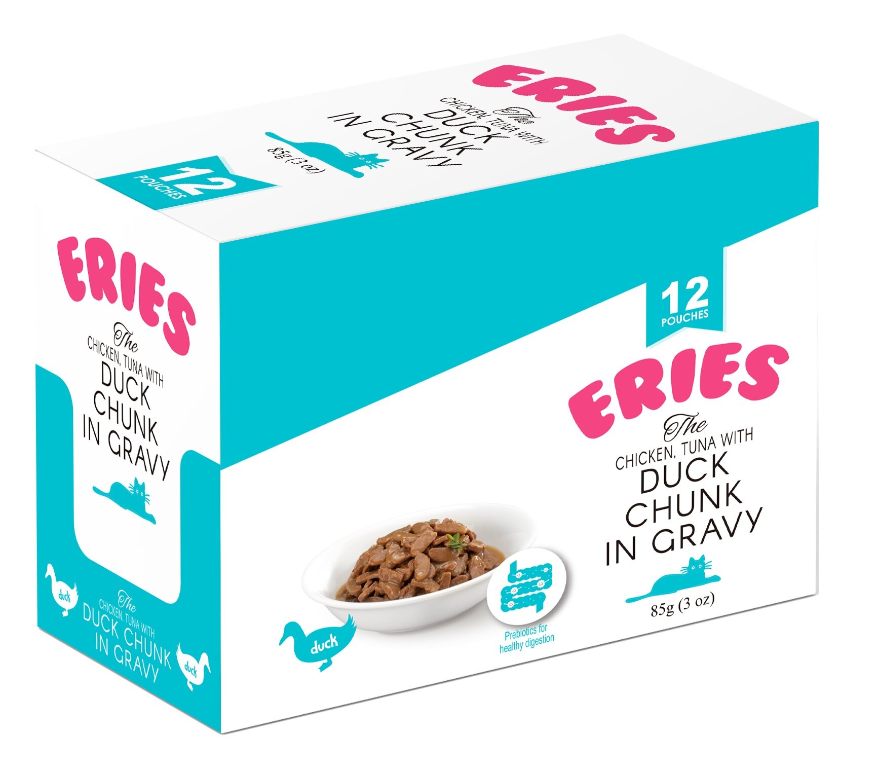 Полнорационный корм для кошек. Нежные кусочки с уткой, курицей и тунцом в аппетитном соусе. Содержит пребиотики для улучшения пищеварения. Паучи Pettric ERIES - 4 причины: 1. Суперпоедаемость. Подойдет даже привередливым кошкам. 2. Полнорационное питание соответствует стандартам AAFCO. 3. Три пребиотика: инулин, FOS и MOS, которые улучшают пищеварение. Пищеварительная система кошек предназначена для переваривания пищи, содержащей животные белки и жиры. Но для правильного пищеварения требуются и растительные волокна, которые содержатся в пребиотиках. • Инулин, фруктоолигосахариды (FOS) и маннанолигосахариды (MOS) идеально подходят кошкам как источник клетчатки и поддерживают баланс микрофлоры. 4. Суперпремиальное качество, подтвержденное сертификатами безопасности. Ингредиенты: курица, красное мясо тунца, пшеничная мука, куриная печень, утка, минералы и витамины, гидролизат куриного белка, вкусовая добавка, гуаровая камедь, экстракт юкки, пребиотики (инулин, FOS, MOS), таурин, вода. Гарантированный анализ: сырой протеин 8%, сырой жир 3%, сырая клетчатка 0.2%, влажность 76%, сырая зола 1.5%, кальций 0.25%, фосфор 0.28%. Калорийность: 93.9 ккал/100 г. Нормы кормления: котята до 4 месяцев: 1 пакетик на 0.5 кг веса, котята 4-8 месяцев и кормящие кошки: 1 пакетик на 1 кг веса, котята старше 8 месяцев: 1 пакетик на 1.2 кг веса, взрослые кошки: 1 пакетик на 1.3-1.6 кг веса.
