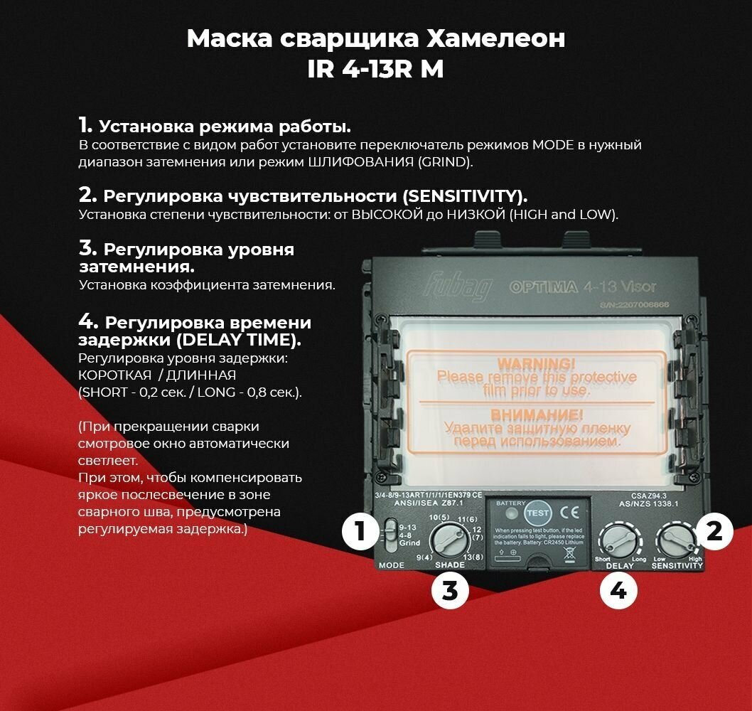 Маска сварщика Fubag “Хамелеон” OPTIMA 4-13 VISOR с улучшенным оснащением гарантирует комфортную работу и эффективную защиту глаз сварщика. Благодаря двум диапазонам затемнения светофильтр легко настраивается для различных типов сварки и резки. Расширенная зона обзора (100х65 мм) сделает процесс сварки более удобным. Питание маски обеспечивают солнечная батарея и сменный аккумулятор. Плавная настройка чувствительности и степени затемнения позволяют точно выставлять необходимые параметры. Усовершенствованный механизм регулировки позволяет настраивать угол наклона, сдвига вперед/назад и размер.