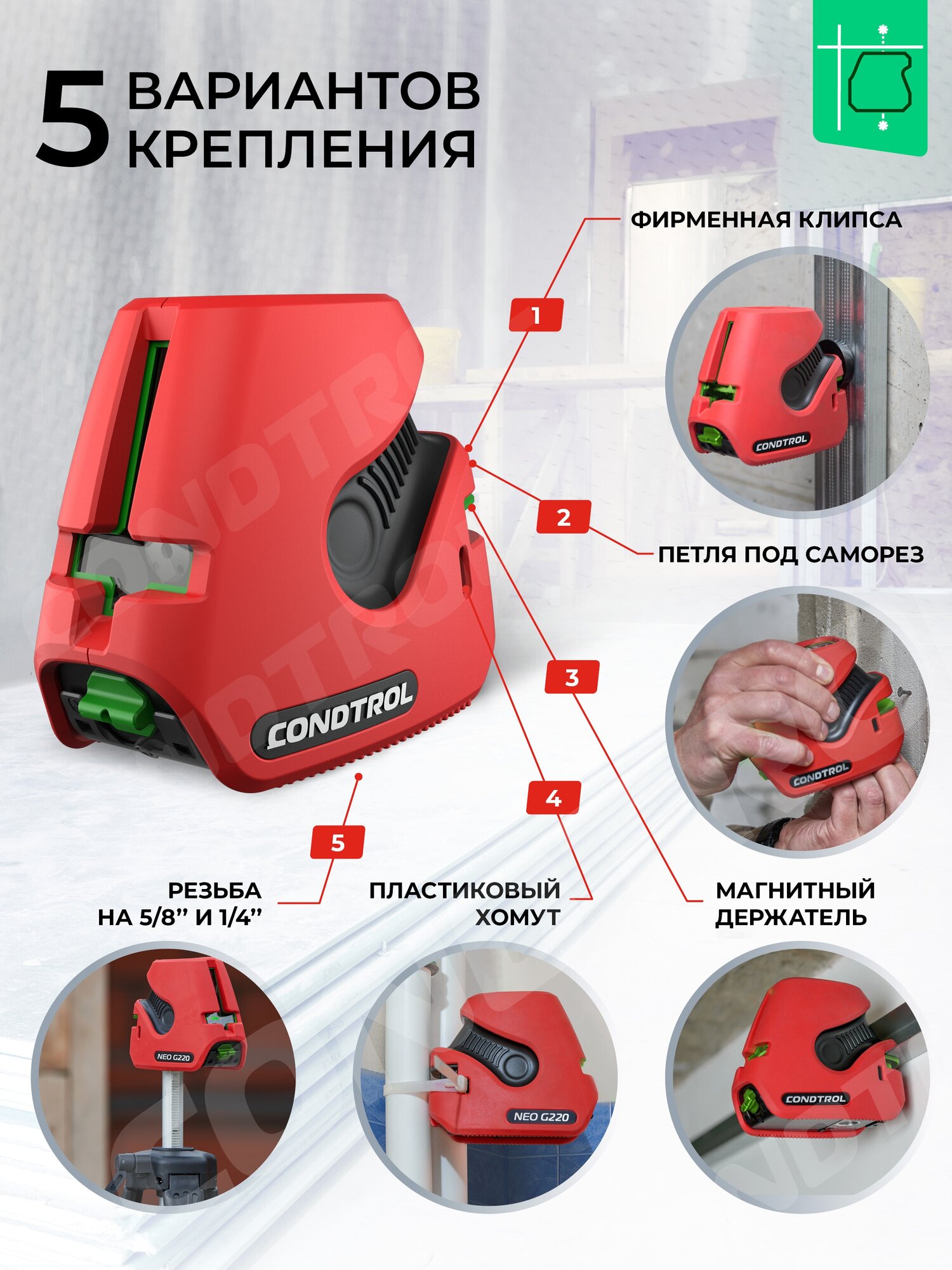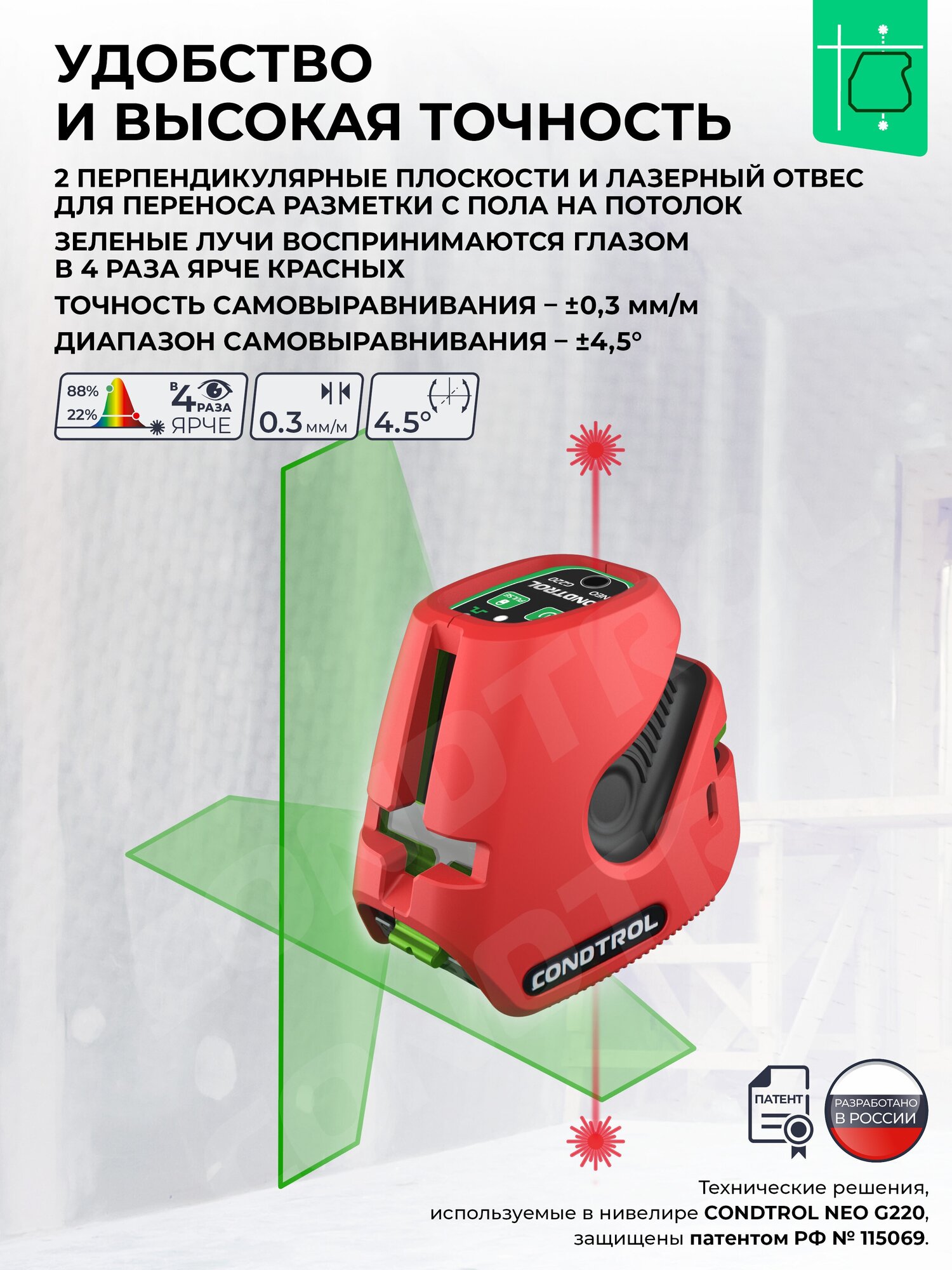 Нивелир лазерный CONDTROL оснащен зеленым лазером с длиной волны 532нм. Корпус нивелира Neo G220 сделан для работы на стройке, он надежно защищен от пыли, грязи, брызг и покрыт противоударным силиконовым чехлом. В области захвата корпус имеет противоскользящую ребристую поверхность. Имеет функцию проекции наклонных плоскостей.