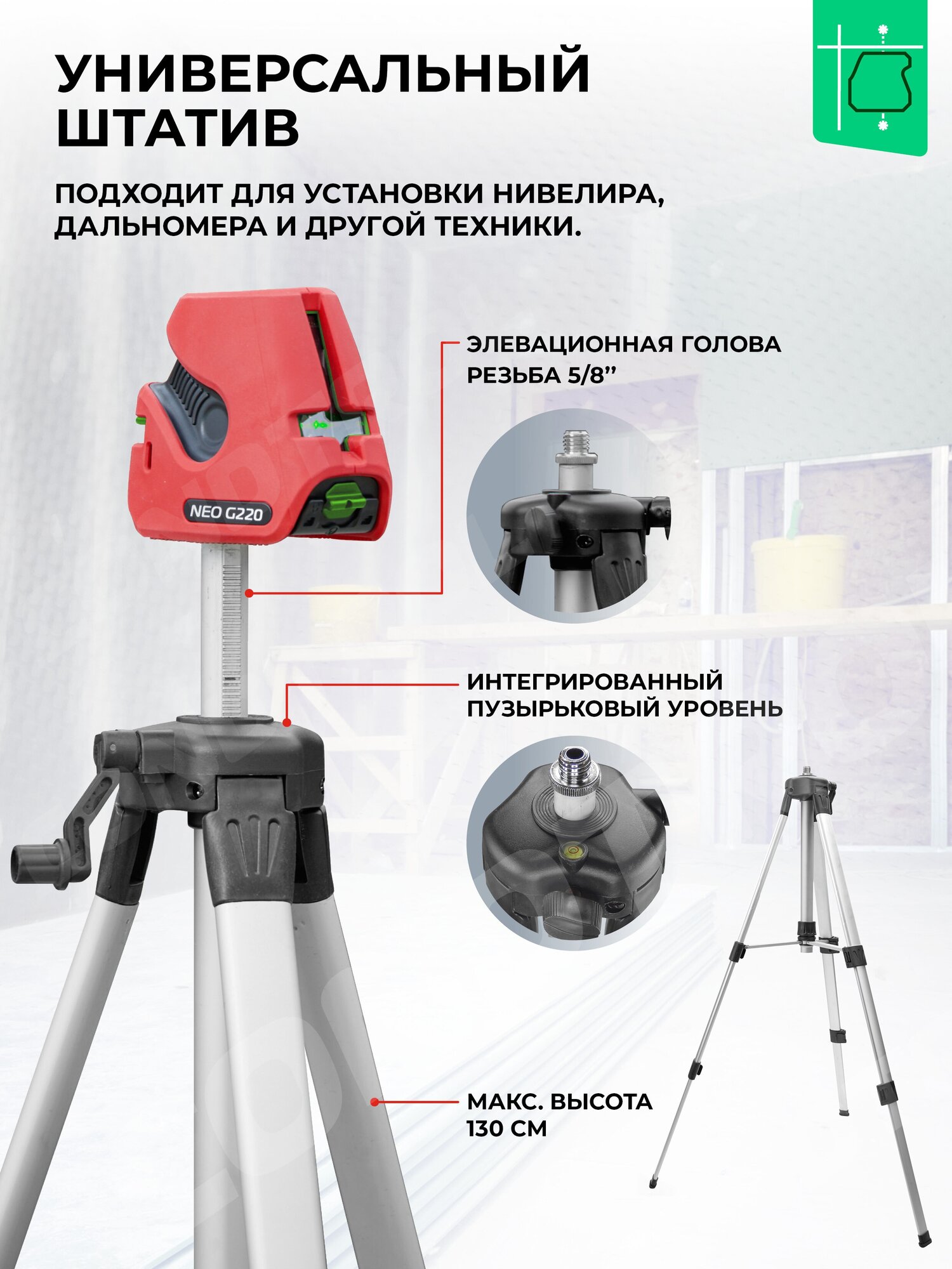 Отличительной особенностью лазерного нивелира Neo G220 является наличие лазерного отвеса, позволяющего переносить разметку с пола на потолок.