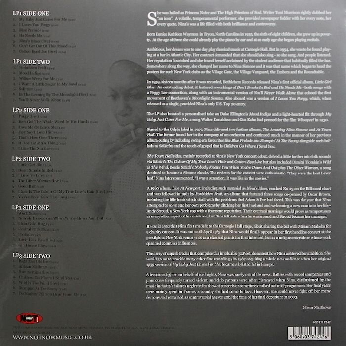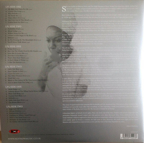 Платиновая компиляция избранных, лучших записей и хитов Нины Симон из серии "The Platinum Collection". Издание на тройном цветном виниле. Нина Симон - американская певица, пианистка, композитор, аранжировщица. Придерживалась джазовой традиции, однако использовала самый разный исполняемый материал, сочетала джаз, соул, поп-музыку, госпел и блюз, записывала песни с большим оркестром. За свою карьеру Нина Симон выпустила 170 студийных и концертных альбомов и синглов, исполнила более 320 песен. A1. My Baby Just Cares For MeA2. I Loves You PorgyA3. Blue PreludeA4. He Needs MeA5. Nina's Blues (Live)A6. Can't Get Out Of This MoodA7. Cotton Eyed Joe (live)B1. Forbidden FruitB2. Mood IndigoB3. Willow Weep For MeB4. I Want A Little Sugar In My BowlB5. SolitaireB6. In The Evening By The Moonlight (live)B7. You'll Never Walk AloneC1. Porgy (live)C2. He's Got The Whole Word In His HandsC3. Love Me Or Leave MeC4. Just Say I Love HimC5. That's Him Over ThereC6. It Don't Mean A ThingC7. I Like The SunriseD1. Little Girl BlueD2. Don't Smoke In BedD3. I Love To LoveD4. The Other Woman (live)D5. Good BaitD6. Black Is The Colour Of My True Love's Hair (live)D7. You've Been Gone Too LongE1. Work SongE2. Nobody Knows You When You're Down And OutE3. Plain Gold RingE4. Central Park BluesE5. SolitudeE6. Little Liza Jane (live)E7. Gin House BluesF1. Rags And Old IronF2. African MailmanF3. Summertime (live)F4. Children Go Where I Send YouF5. Wild Is The Wind (live)F6. Stompin' At The SavoyF7. Do Nothin' Till You Hear From Me