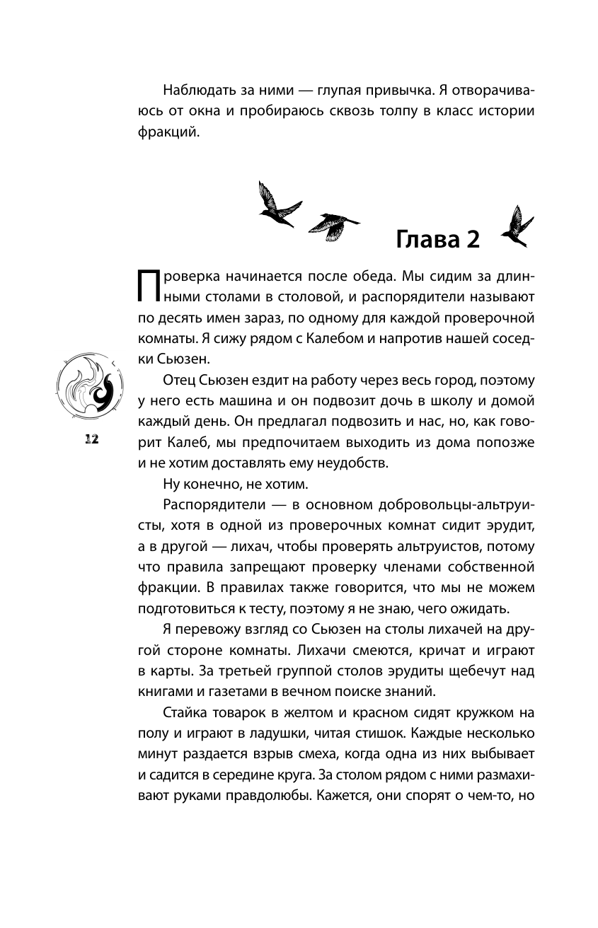 Беатрис Прайор живет в государстве, разделенном на пять фракций. Фракция превыше семьи. Твоя добродетель определяет твою роль в обществе, твое будущее. Беатрис исполнилось шестнадцать, и она должна выбирать свой путь. Но в день проверки склонностей девушке открывается тайна, которая перевернет всю ее жизнь. Она решается на рискованный поступок, который разобьет сердца ее близких, но даст самой Беатрис шанс стать одной из тех, кем она восхищается. Или это просто погубит ее.