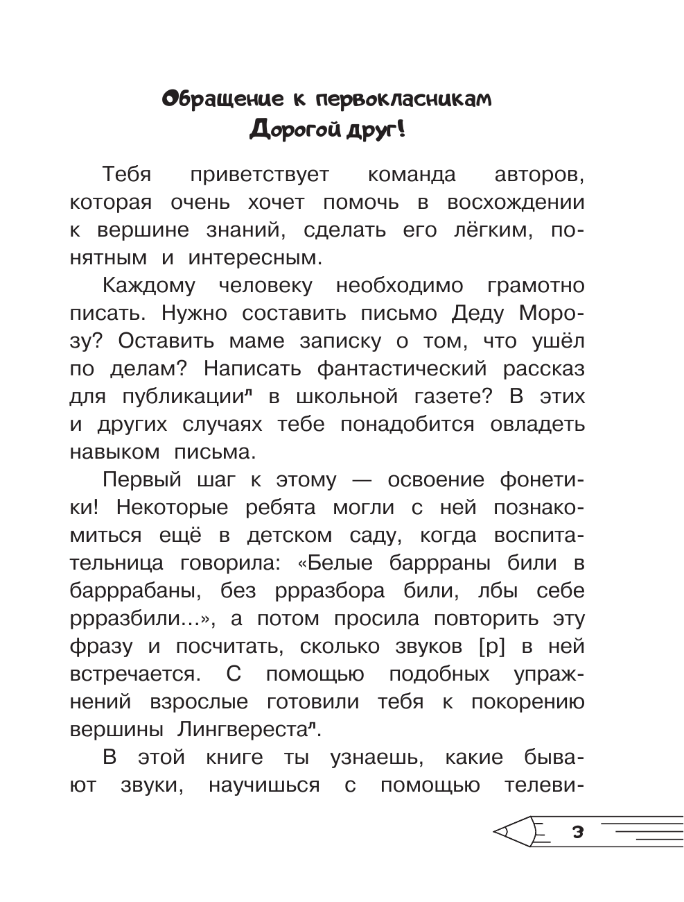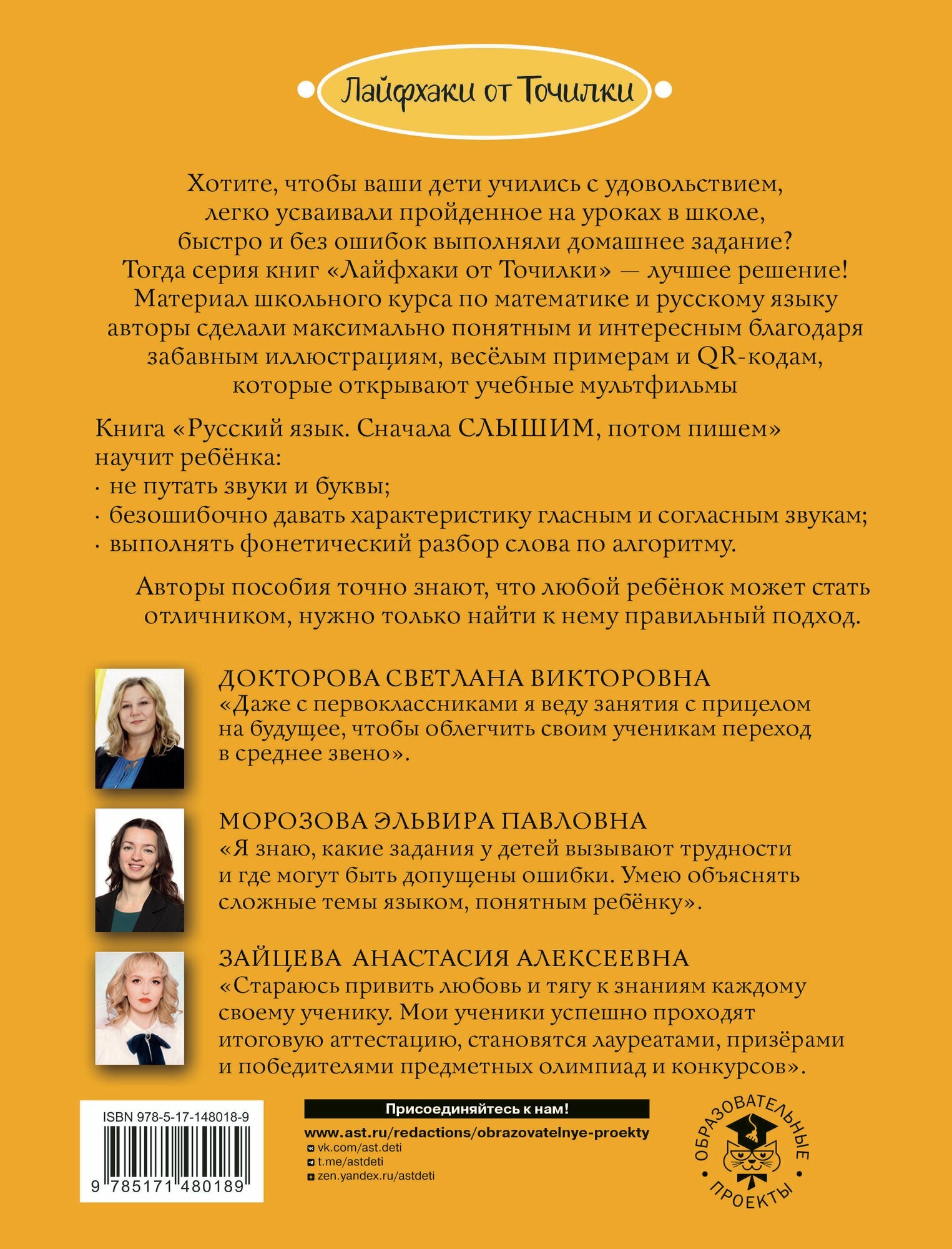 Хотите, чтобы ваши дети учились с удовольствием, легко усваивали пройденное на уроках в школе, быстро и без ошибок выполняли домашнее задание? Тогда серия книг "Лайфхаки от Точилки" - лучшее решение! Материал школьного курса по математике и русскому языку авторы сделали максимально понятным и интересным благодаря забавным иллюстрациям, веселым примерам и QR-кодам, которые открывают учебные мультфильмы. Книга "Русский язык. Сначала слышим, потом пишем" научит ребенка:. не путать звуки и буквы;. безошибочно давать характеристику гласным и согласным звукам;. выполнять фонетический разбор слова по алгоритму. Авторы пособия точно знают, что любой ребенок может стать отличником, нужно только найти к нему правильный подход.