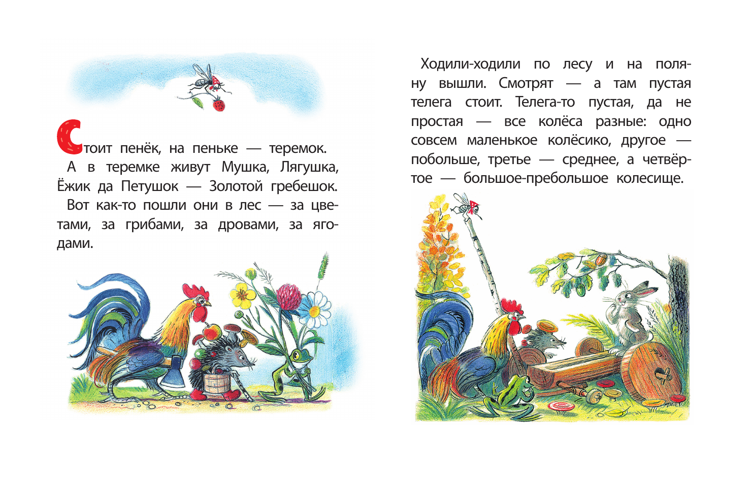 Нашли однажды Мушка, Лягушка, Ежик и Петушок телегу: телега хорошая, но колеса у нее все разные. Но друзья не стали унывать, а решили колеса забрать - в хозяйстве пригодятся! Так и вышло, стоило только применить немного находчивости и фантазии. А какие полезные вещи из колес получились - узнаете из этой книжки! Владимир Григорьевич Сутеев - классик отечественной детской литературы. Его сказки - простые, понятные, но по-своему увлекательные - особенно интересны самым маленьким читателям. Ведь почти каждая фраза в них сопровождается рисунком, и историю можно проследить по картинкам. Эта книга предназначена именно для малышей: в ней яркие рисунки и крупные буквы, плотный картон не порвется при чтении, а скругленные уголки не повредят маленькие пальчики.