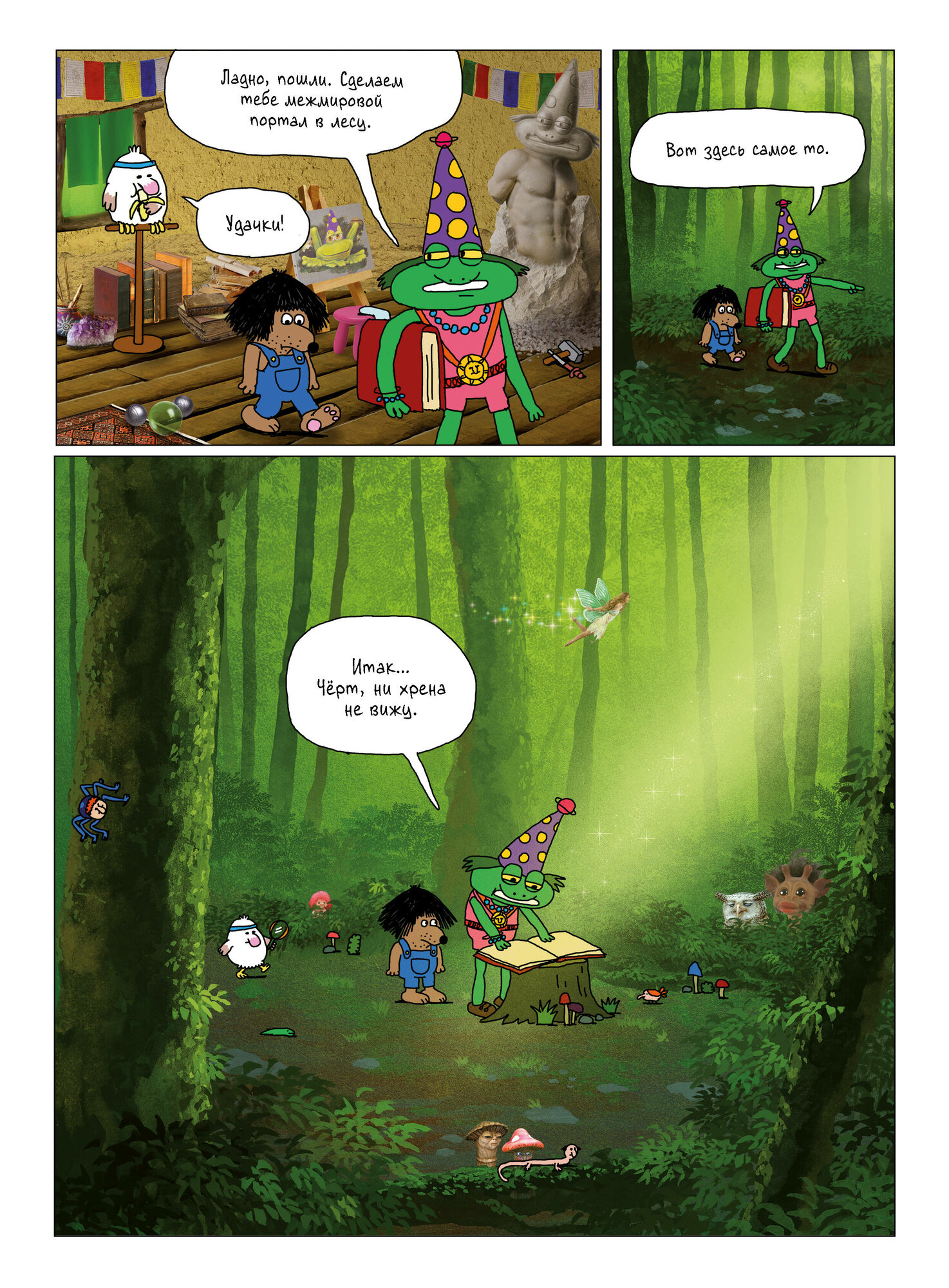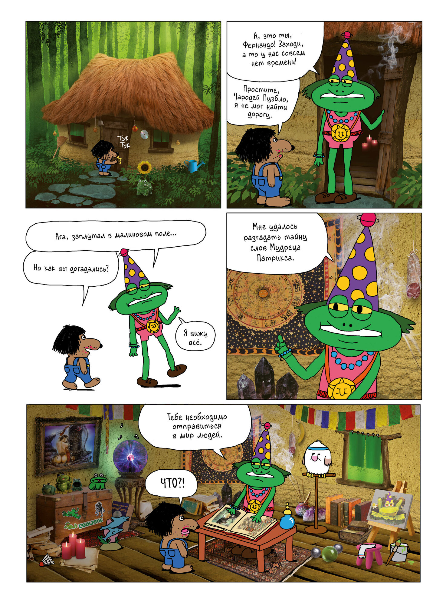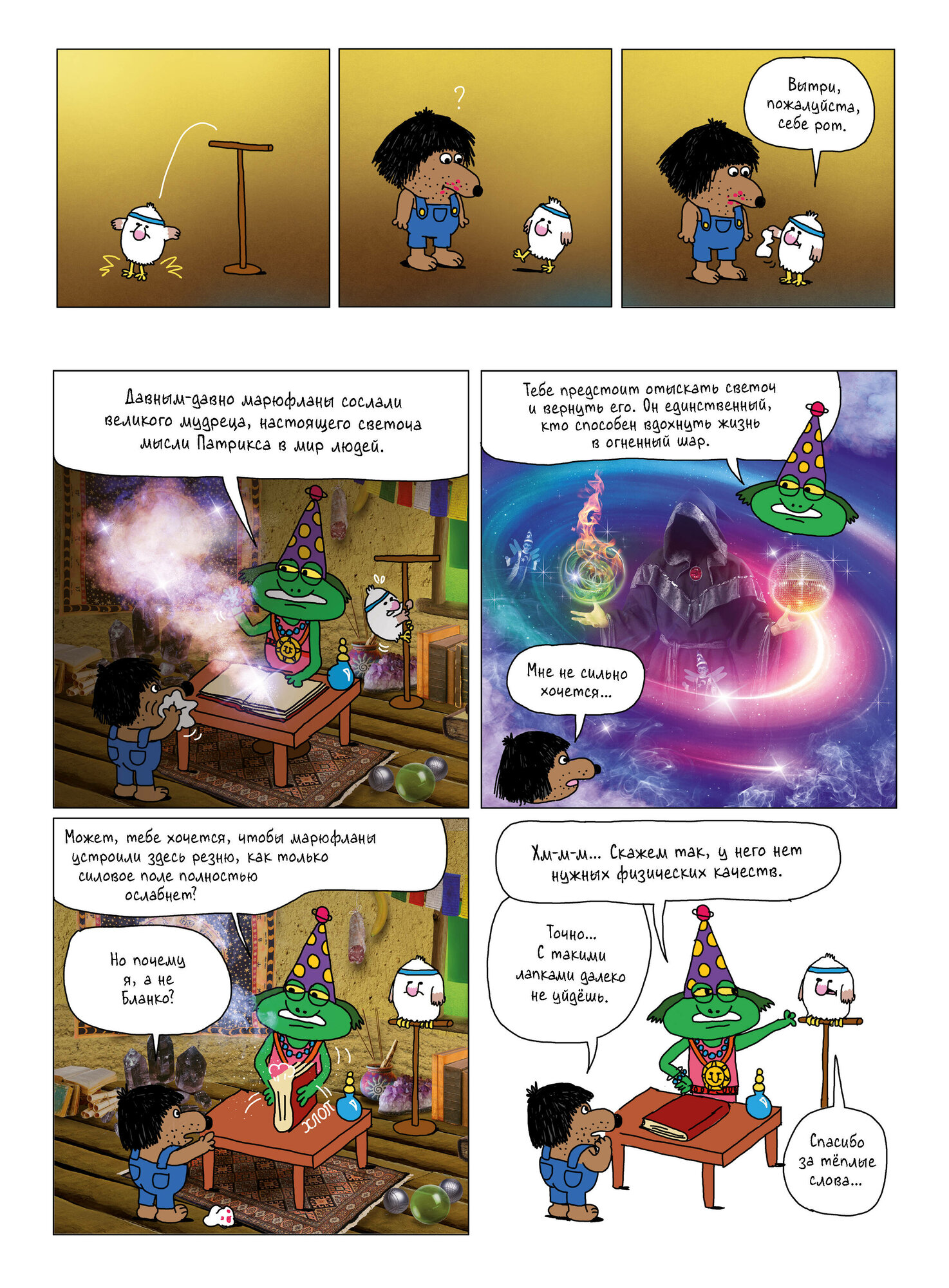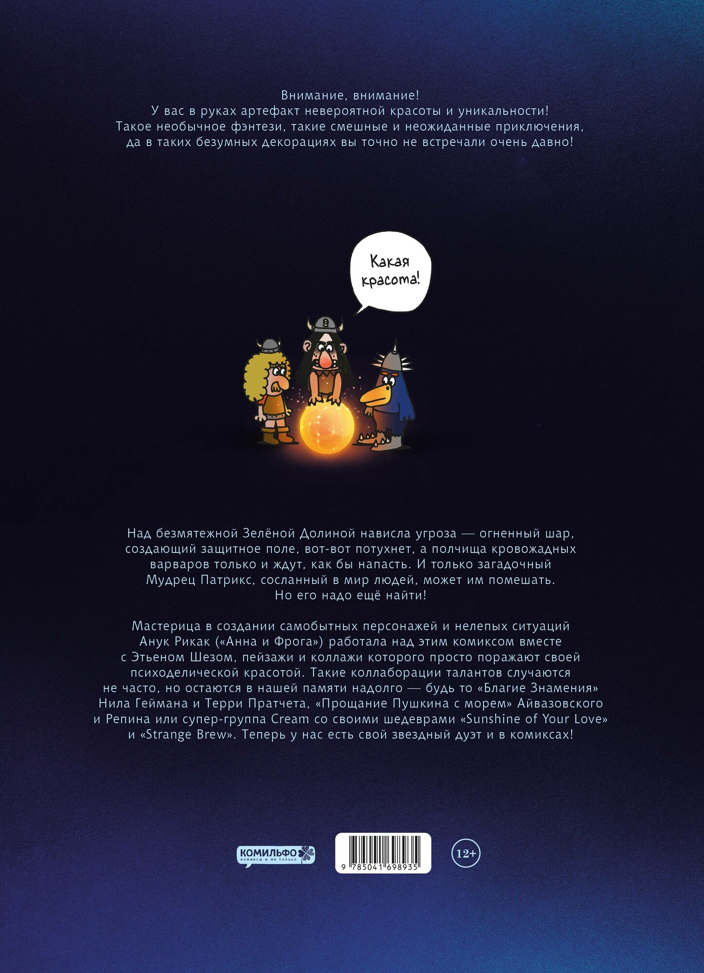 Внимание, внимание! Сие произведение — артефакт невероятной красоты и уникальности! Такое необычное фэнтези, такие смешные и неожиданные приключения, да в таких безумных декорациях вы точно не встречали очень давно! Над безмятежной Зелёной Долиной нависла угроза — огненный шар, создающий защитное поле, вот-вот потухнет, а полчища кровожадных варваров только и ждут, как бы напасть. И только загадочный Мудрец Патрикс, сосланный в мир людей, может им помешать. Но его надо ещё найти! Мастерица в создании самобытных персонажей и нелепых ситуаций Анук Рикак ("Анна и Фрога") работала над этим комиксом вместе с Этьеном Шезом, пейзажи и коллажи которого просто поражают своей психоделической красотой. Такие коллаборации талантов случаются не часто, но остаются в нашей памяти надолго — будь то "Благие Знамения" Нила Геймана и Терри Пратчета, "Прощание Пушкина с морем" Айвазовского и Репина или супер-группа Cream со своими шедеврами "Sunshine of Your Love" и "Strange Brew". Теперь у нас есть свой звездный дуэт и в комиксах!