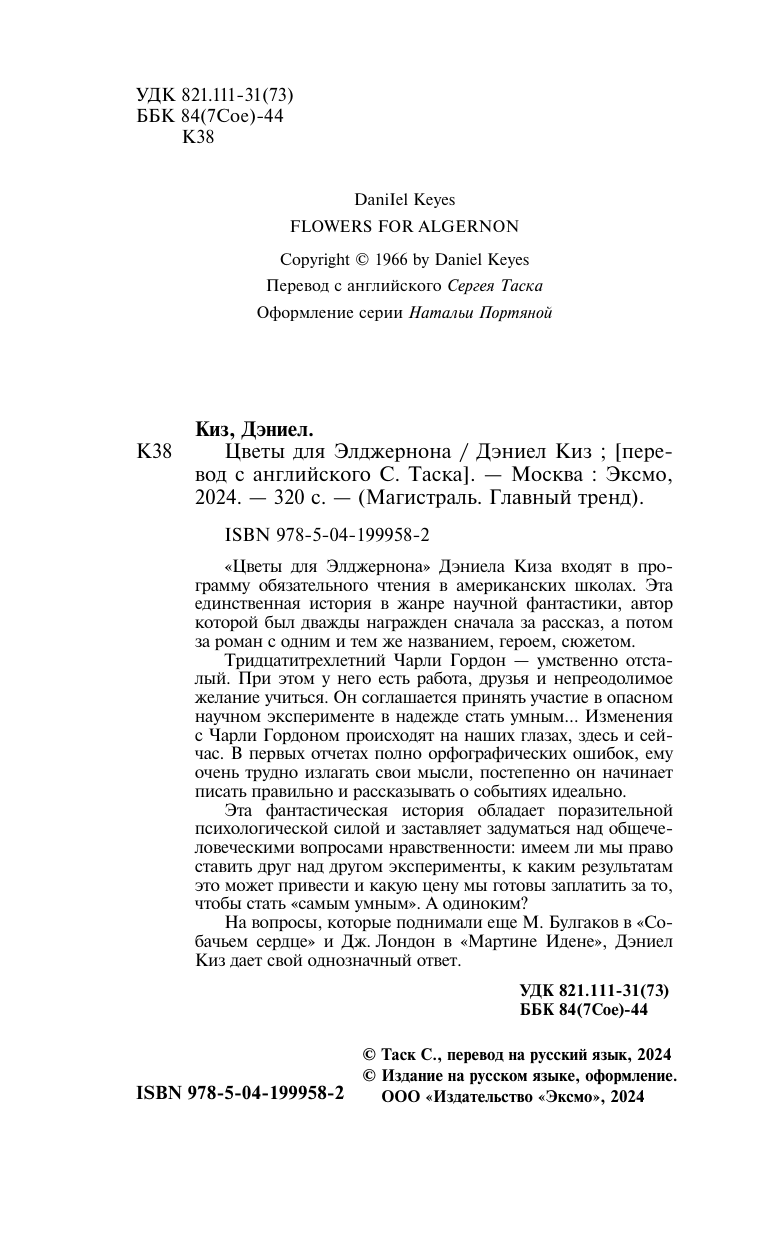 Книга: Цветы для Элджернона (Дэниел Киз); Эксмо, Редакция 1, 2025
