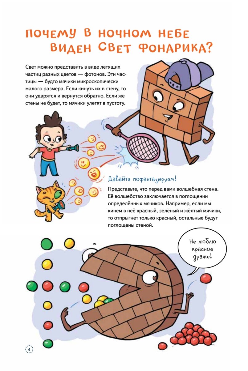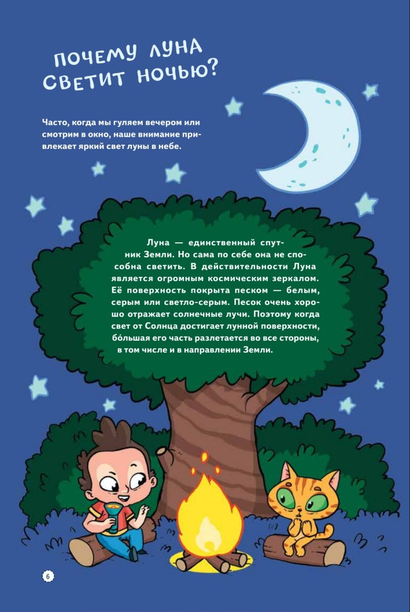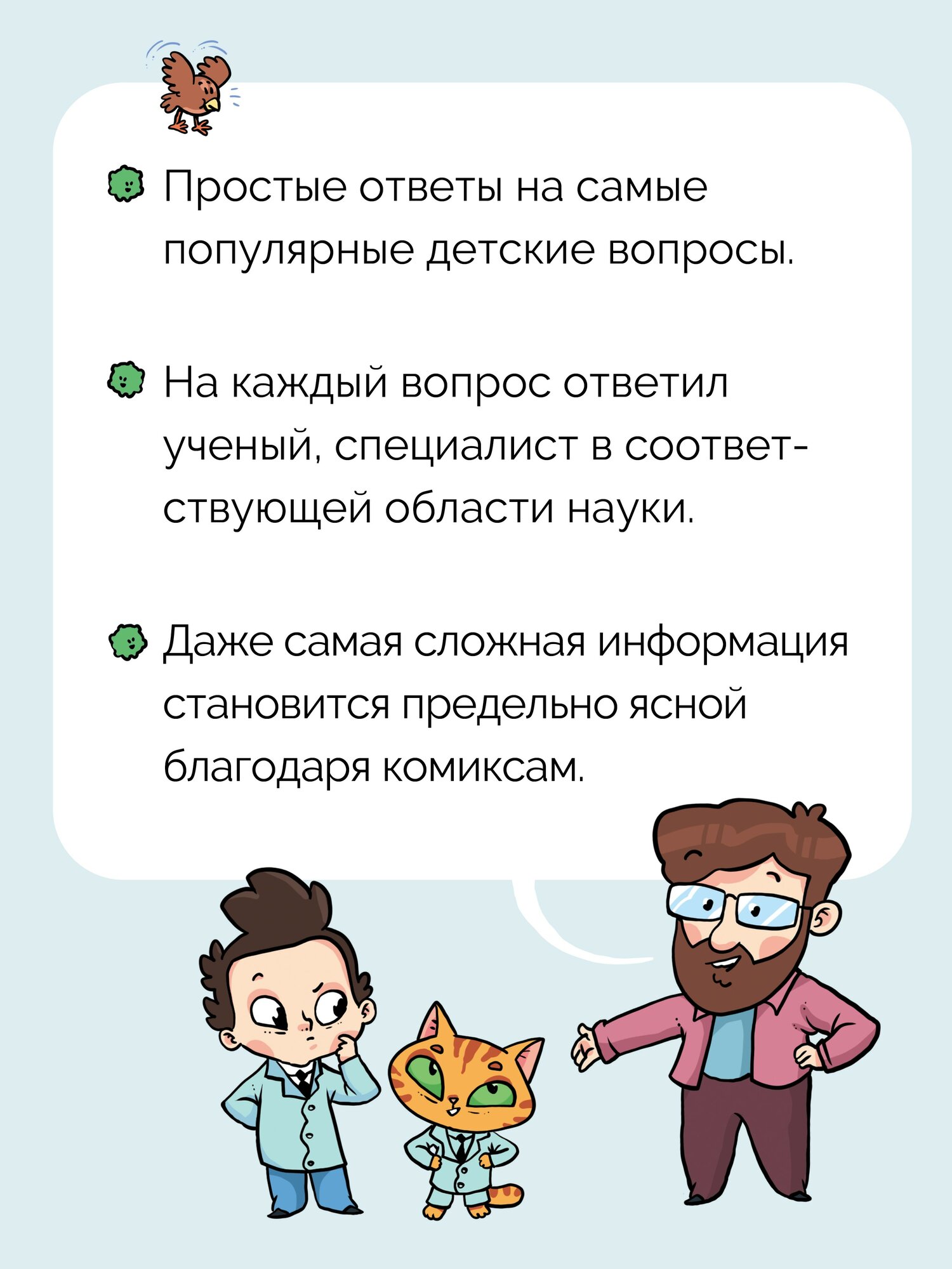 Почему костёр красного цвета? Можно ли поднять планету? Почему самолёты не падают? Существует ли таблетка от глупости? Зачем папа бреет голову, а мама ноги? Об этом и многом другом дети постоянно спрашивают взрослых. Мы собрали самые неожиданные вопросы о нас самих и об окружающем мире, а потом попросили умных старшеклассников, студентов и учёных из самых передовых российских университетов ответить на них. Они рассказали о сложных вещах на понятном детям языке. Благодаря весёлым картинкам художника-комиксиста Евгения Яковлева книга получилась не только познавательной, но и забавной.Над книгой работал коллектив авторов и внештатных корреспондентов научно-популярного журнала "Котёнок Шрёдингера".Для детей младшего и среднего школьного возраста.5 причин прочитать эту книгу своему ребенку:Простые ответы на самые популярные детские вопросы.На каждый вопрос ответил квалифицированный ученый, специалист в соответствующей области науки.Внутри книги вы найдете вопросы и ответы из разных областей знаний: работа человеческого тела, здоровье, эмоции, эволюция, физика, биология и др.Даже самая сложная информация становится предельно ясной благодаря комиксам.Главные персонажи, мальчик-ученый и кот, помогут разобраться с любой, даже самой сложной, темой.