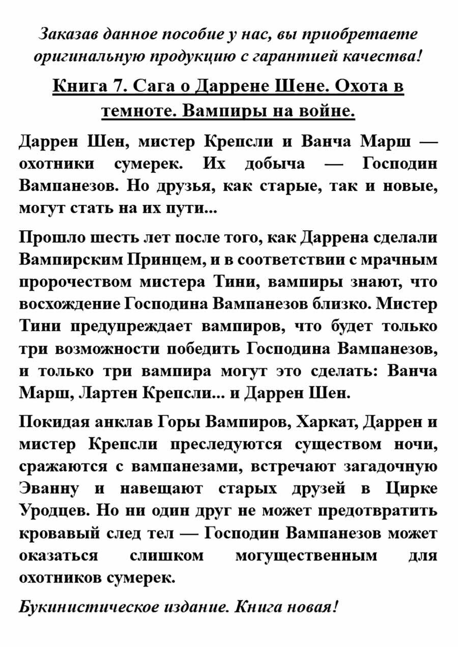 Заказав данное пособие у нас, вы приобретаете оригинальную продукцию с гарантией качества! Книга 7. Сага о Даррене Шене. Охота в темноте. Вампиры на войне. Даррен Шен, мистер Крепсли и Ванча Марш — охотники сумерек. Их добыча — Господин Вампанезов. Но друзья, как старые, так и новые, могут стать на их пути... Прошло шесть лет после того, как Даррена сделали Вампирским Принцем, и в соответствии с мрачным пророчеством мистера Тини, вампиры знают, что восхождение Господина Вампанезов близко. Мистер Тини предупреждает вампиров, что будет только три возможности победить Господина Вампанезов, и только три вампира могут это сделать: Ванча Марш, Лартен Крепсли... и Даррен Шен. Покидая анклав Горы Вампиров, Харкат, Даррен и мистер Крепсли преследуются существом ночи, сражаются с вампанезами, встречают загадочную Эванну и навещают старых друзей в Цирке Уродцев. Но ни один друг не может предотвратить кровавый след тел — Господин Вампанезов может оказаться слишком могущественным для охотников сумерек. Букинистическое издание. Книга новая! The Saga of Darren Shan. Hunters of the Dusk. Vampires at War. Book 7. Darren Shan, Mr Crepsley and Vancha Marsch, are the Hunters of the Dusk. Their quarry – the Vampaneze Lord. But friends old and new may stand in their way… It is six years after Darren was made a Vampire Prince and following a grim prophesy made by Mr Tiny, the vampires know the ascension of the Vampaneze Lord is at hand. Mr Tiny warns the vampires that there will be only three opportunities for the Vampaneze Lord to be vanquished and only three vampires who may succeed: Vancha Marsch, Larten Crepsley… and Darren Shan. Leaving the enclave of Vampire Mountain, Harkat, Darren and Mr Crepsley are shadowed by a creature of the night, do battle with the vampaneze, meet the mysterious Evanna and pay a visit to some old friends at the Cirque Du Freak. But no friend can prevent the bloody trail of bodies – the Vampaneze Lord may be more than a match for the hunters of the dusk.