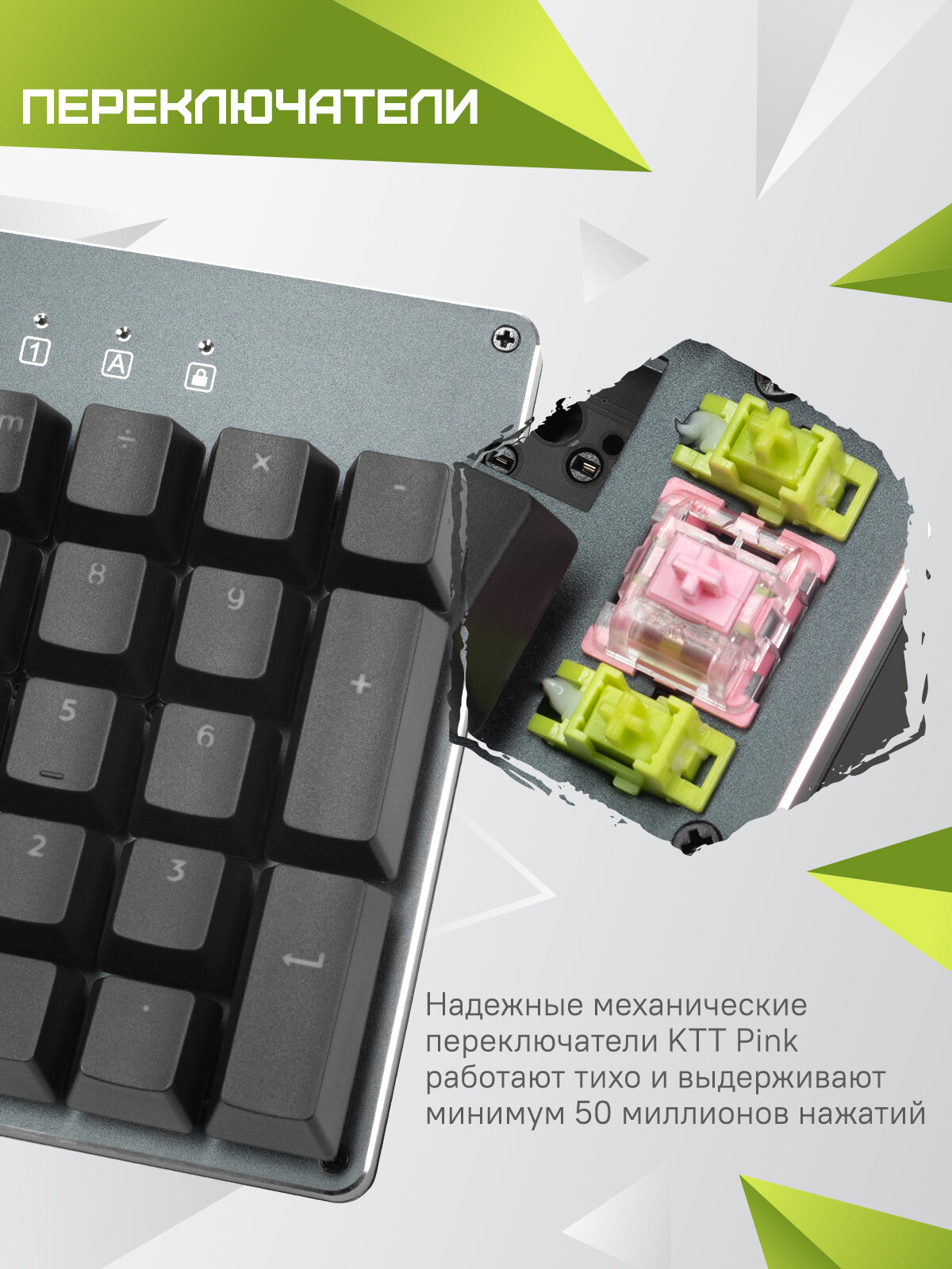 Клавиатура ZONE 51 - это высококачественное устройство, которое обеспечивает комфорт и удобство в использовании.Линейные механические переключатели KTT Pink гарантируют плавное и точное нажатие клавиш. Благодаря этому, вы сможете быстро и без ошибок набирать текст, а также играть в игры с высокой точностью.Anti-Ghosting всех клавиш предотвращает случайное нажатие нескольких клавиш одновременно, что особенно важно при работе с текстовыми документами или в играх.Продвинутая шумоизоляция ключевых зон обеспечивает тихую работу клавиатуры, что позволяет сосредоточиться на работе или игре без лишних помех.Full-Size формат клавиатуры позволяет использовать все 104 клавиши, включая цифровой блок.Яркая RGB подсветка позволяет комфортно работать или играть даже при слабом освещении.Клавиатура подключается к компьютеру или ноутбуку через USB-интерфейс, что обеспечивает быструю и простую установку.Вес клавиатуры составляет всего 1150 грамм, а длина кабеля - 1,8 метра, что делает ее удобной для использования в любом месте.В целом, клавиатура ZONE 51 - это надежное и функциональное устройство, которое станет незаменимым помощником в вашей повседневной работе или игре.