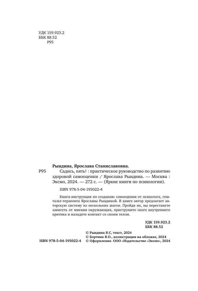 Садись пять! Практическое руководство по развитию здоровой самооценки (Ярослава Рындина); Эксмо, БОМБОРА, 2024