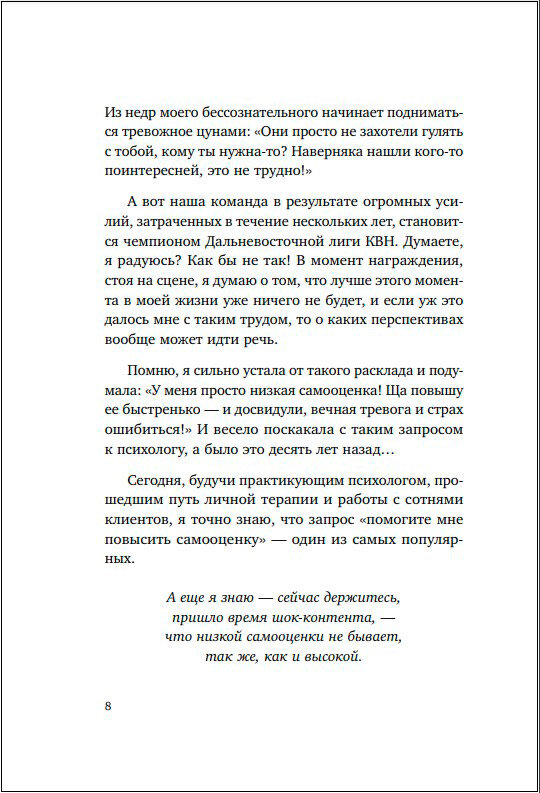 Книга-инструкция по созданию самооценки от психолога, гештальт-терапевта Ярославы Рындиной. В книге автор предлагает авторскую систему из нескольких шагов. Пройдя их вы перестанете зависеть от мнения окружающих, приструните свого внутреннего критика и наладите контакт со своим телом.