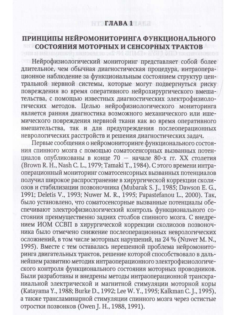 В книге описаны стандартные протоколы нейромониторинга при различных типах оперативных вмешательств на спинном и головном мозге. Раскрыты методики нейрофизиологического мониторинга, включающие регистрацию электроэнцефалограммы, вызванных потенциалов мозга различных модальностей, спонтанной и вызванной электромиограммы, электрокортикографии. Описаны возможности электрофизиологического мониторинга в прогнозировании исходов затяжных бессознательных состояний, количественного электрофизиологического контроля патогенетической нейропротекции у больных с энцефалопатиями.