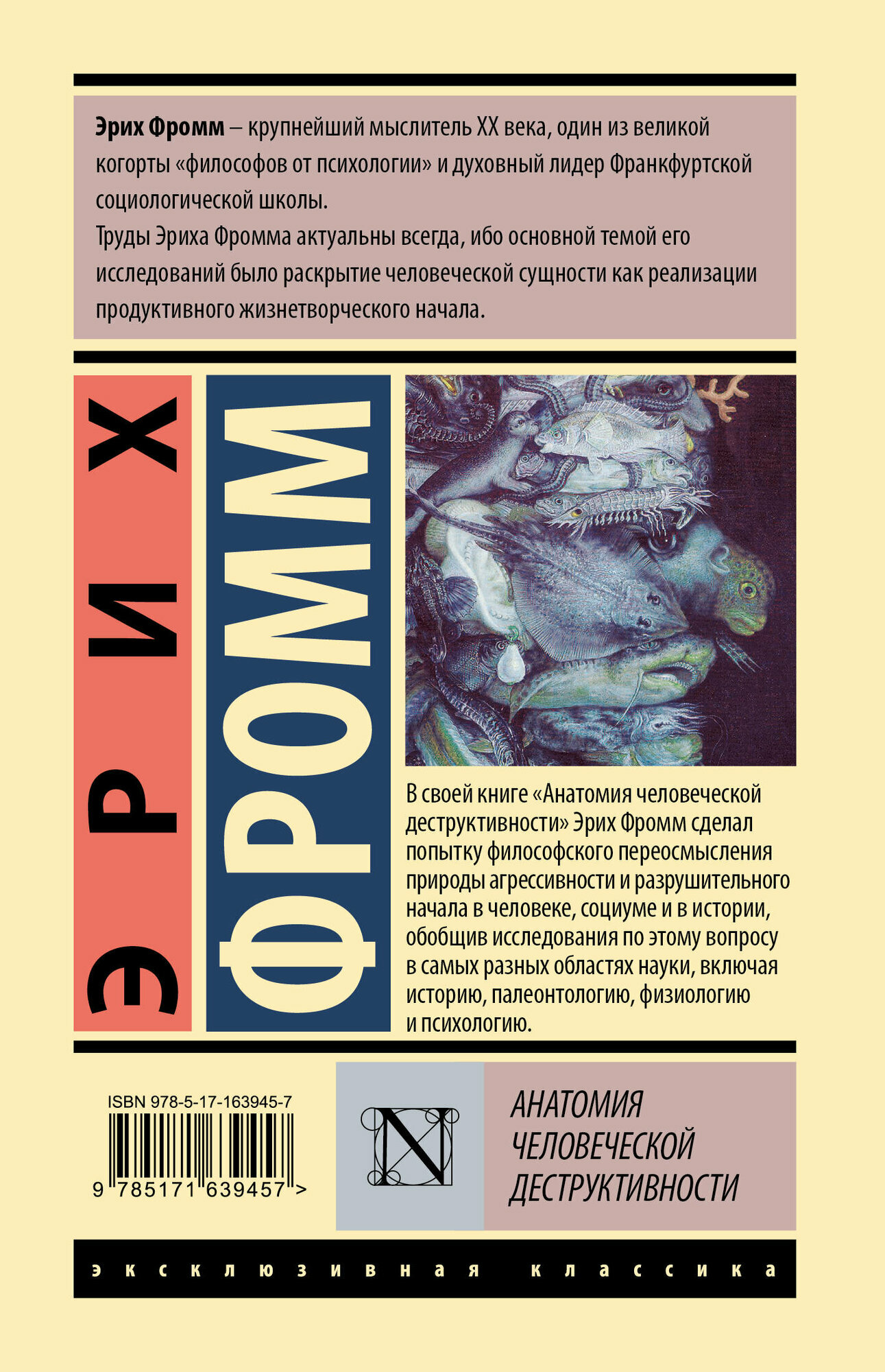 В своей книге "Анатомия человеческой деструктивности" Эрих Фромм сделал попытку философского переосмысления природы агрессивности и разрушительного начала в человеке, социуме и в истории, обобщив исследования по этому вопросу в самых разных областях науки, включая историю, палеонтологию, физиологию и психологию.