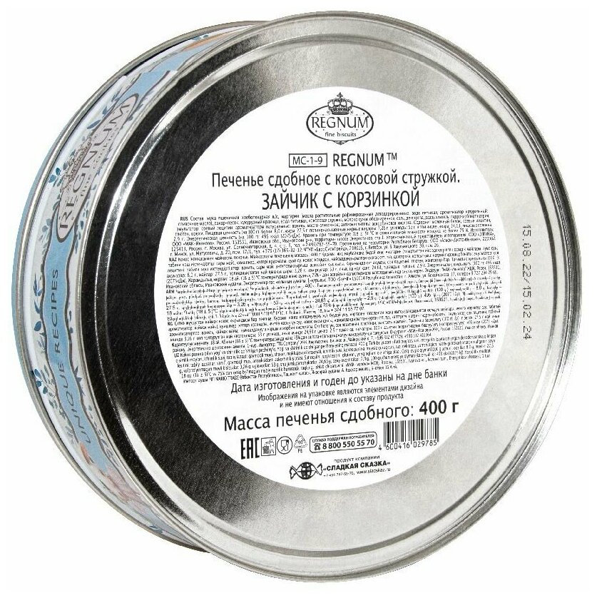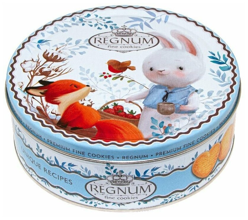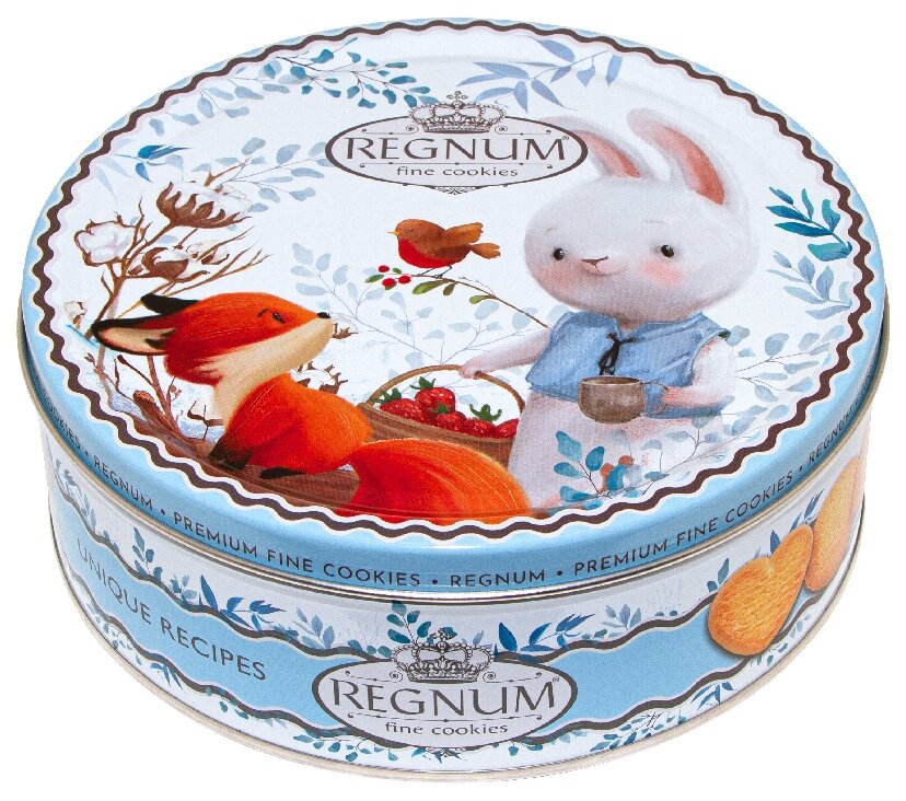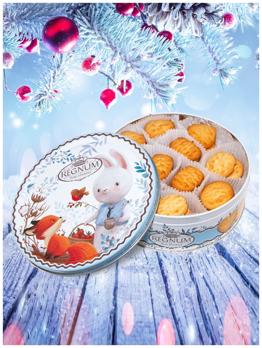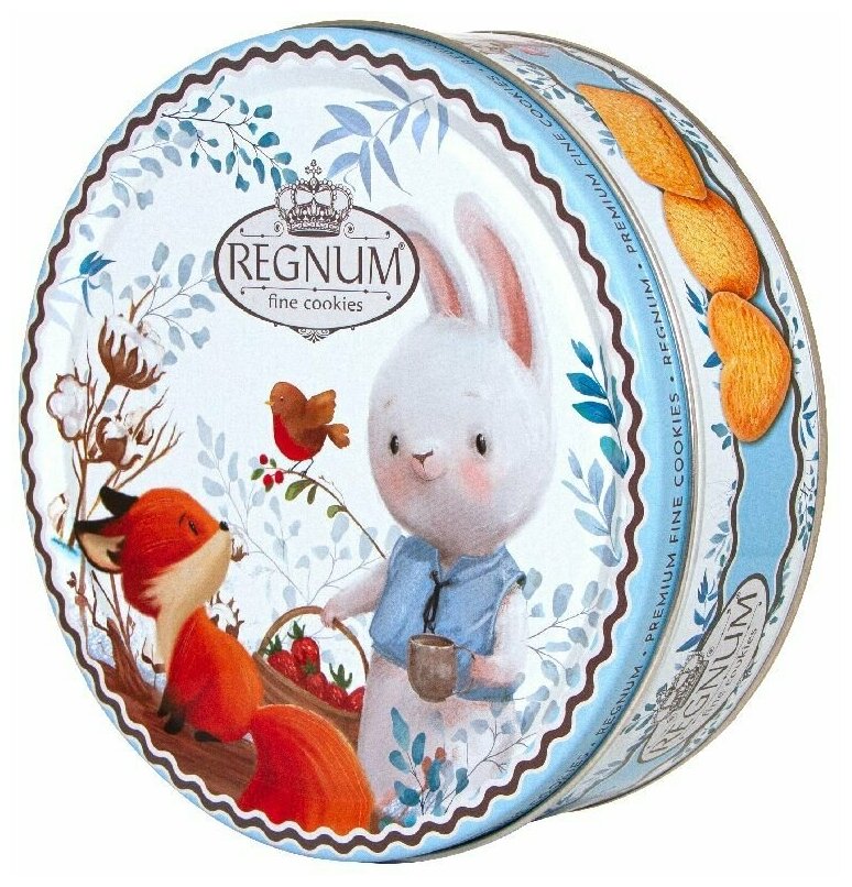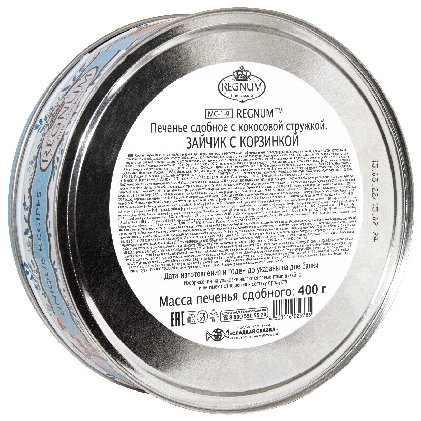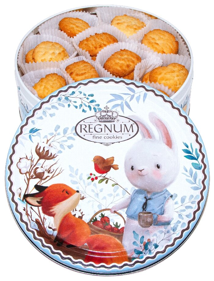 Сдобное печенье с кокосовой стружкой Regnum «Зайчик с корзинкой» от группы компаний «Сладкая сказка» — отличный подарок на Новый год и Рождество. Кокосовая стружка придаёт печенью рассыпчатую структуру и тёплый, сладкий и нежный аромат. Картинка зайчика с лисёнком на крышке пропитана добротой и нежными чувствами. Такую банку хочется дарить тем, кого ты особенно любишь. Сдобное печенье с кокосом производится на собственной российской фабрике по проверенной рецептуре и не содержит трансжиры, искусственные красители и ароматизаторы. Банку, после того, как печенье закончится, можно использовать для хранения различных мелочей, домашней выпечки или конфет.