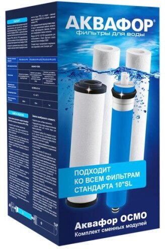 | Особенности | в комплекте три модуля PP20 - предварительная очистка, B510-03 - сорбционный модуль глубокой очистки, PP5 - финишная очистка, для фильтров Аквафор Осмо, типоразмер корпуса 10 Slim Line |