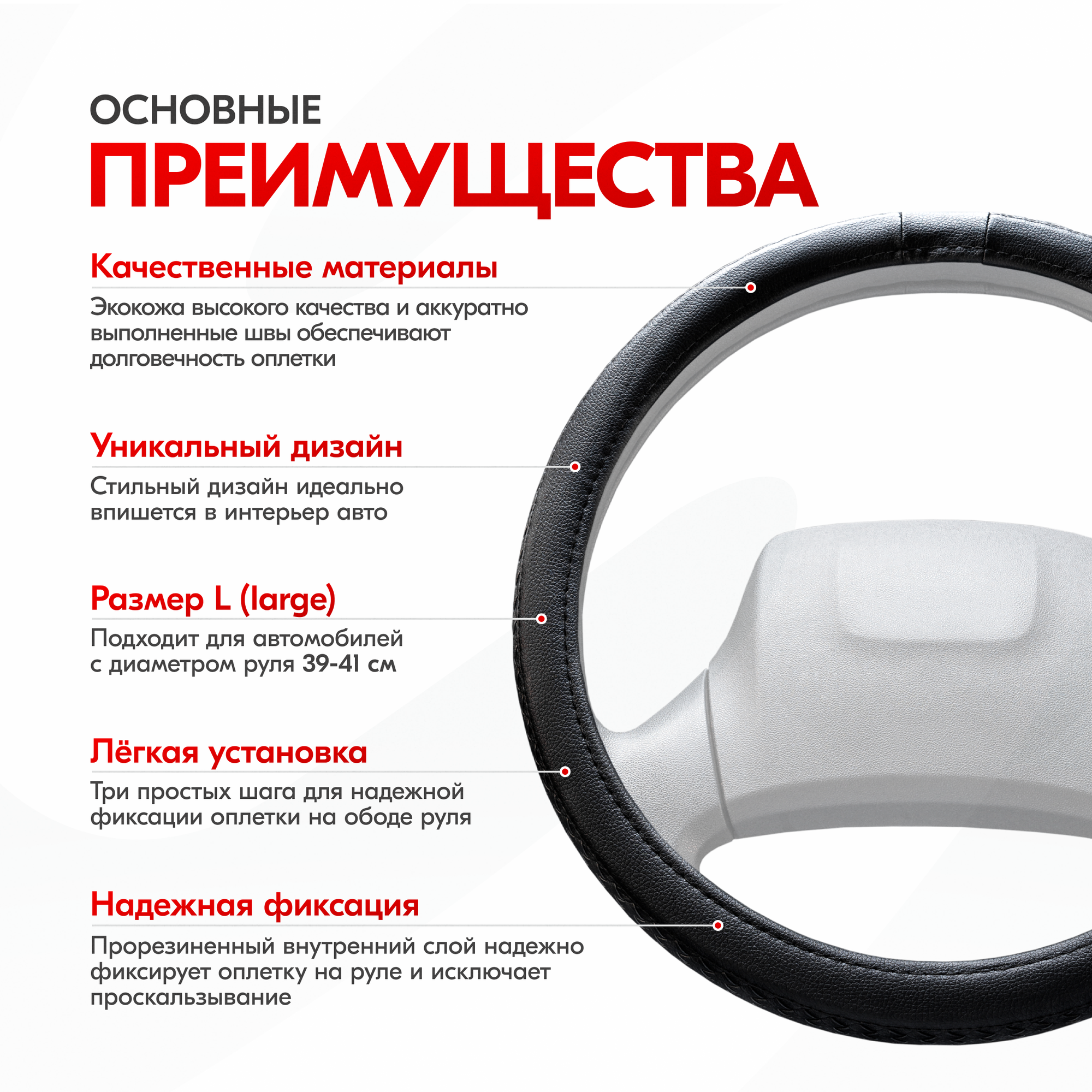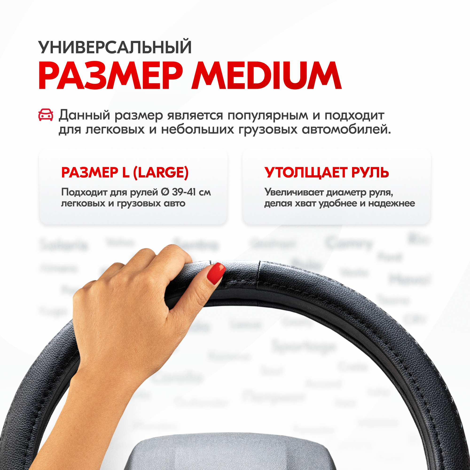 Оплетка на руль - сверхпопулярный автомобильный аксессуар. Сделана из высококачественного материала экокожа. Практичный черный цвет отлично вписывается в любой интерьер. Стильный дизайн выгодно подчеркнет хороший вкус автовладельца и его индивидуальность. Оплетка на руль Modern-5 размера «L» подходит на множество авто. Таких, как Toyota, Honda, Hyundai, Kia, ВАЗ, нива, LADA и большинство китайских автомобилей. На руль оплетка устанавливается легко, не требует долгих манипуляций, достаточно минимума усилий и предварительного нагрева для более легкого надевания. Поэтому справится даже хрупкая девушка.Внимание! Важно ознакомиться с последовательностью натягивания оплетки (см. слайд). Нагреть оплетку можно обычным феном, на солнце или горячим воздухом в машине.Тянется при установке, при этом отлично держит форму и плотно прилегает к рулю, повторяя его рельеф и изгибы. Вот почему чехол на руль автомобиля универсальный. Преимущества: износостойкая, без запаха, устойчива к царапинам и порезам.Чехол на руль с отменными рабочими характеристиками: скрывает имеющиеся потертости и царапины, уберегает от появления новых. Оплетка на руль не перегревается летом от солнечных лучей и не обжигает руки, а зимой не дубеет на морозе, не растрескивается, материал оплетки очень приятный на ощупь.За счет красивого внешнего вида чехол на руль автомобиля хорош как подарок девушке, как подарок мужчине в машину.Противоскользящий материал ПВХ с внутренней стороны гарантирует - оплетка не будет смещаться по ободу колеса, обеспечит крепкое сцепление с его поверхностью, что критично важно во время вращения руля.