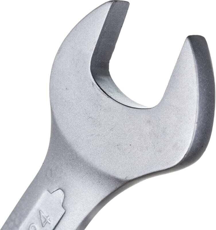 Ключи изготовлены из высококачественной хром-ванадиевой стали. Тело ключа изготовлено методом горячей ковки, что придаёт ему высокую прочность и долговечность. Финишное прочное хромированное покрытие защищает ключ от воздействия коррозии, делает его более износостойким и легко очищается от загрязнений. Продуманный профиль накидной части ключа смещает пятно контакта с ребра грани на её поверхность, что предотвращает повреждение болтов и гаек даже при самых высоких нагрузках. Эргономичный профиль рукоятки ключа позволяет развивать большее усилие без риска повреждения кистей рук. Материал: cталь CrV50BV30 Твёрдость: 45-47 HRC Покрытие: Матовое хромирование