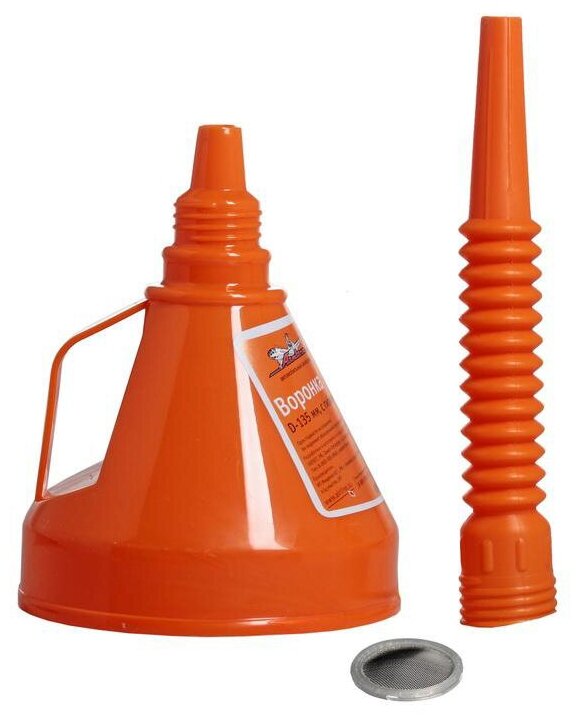 Воронка поможет аккуратно произвести процесс переливания жидкостей. Данная воронка имеет диаметр 135 мм. Благодаря гибкому носику воронки изделие можно расположить в любом удобном положении и под необходимым углом. Воронка укомплектована специально мелкоячеистой сеткой для фильтрации мусора при переливании.