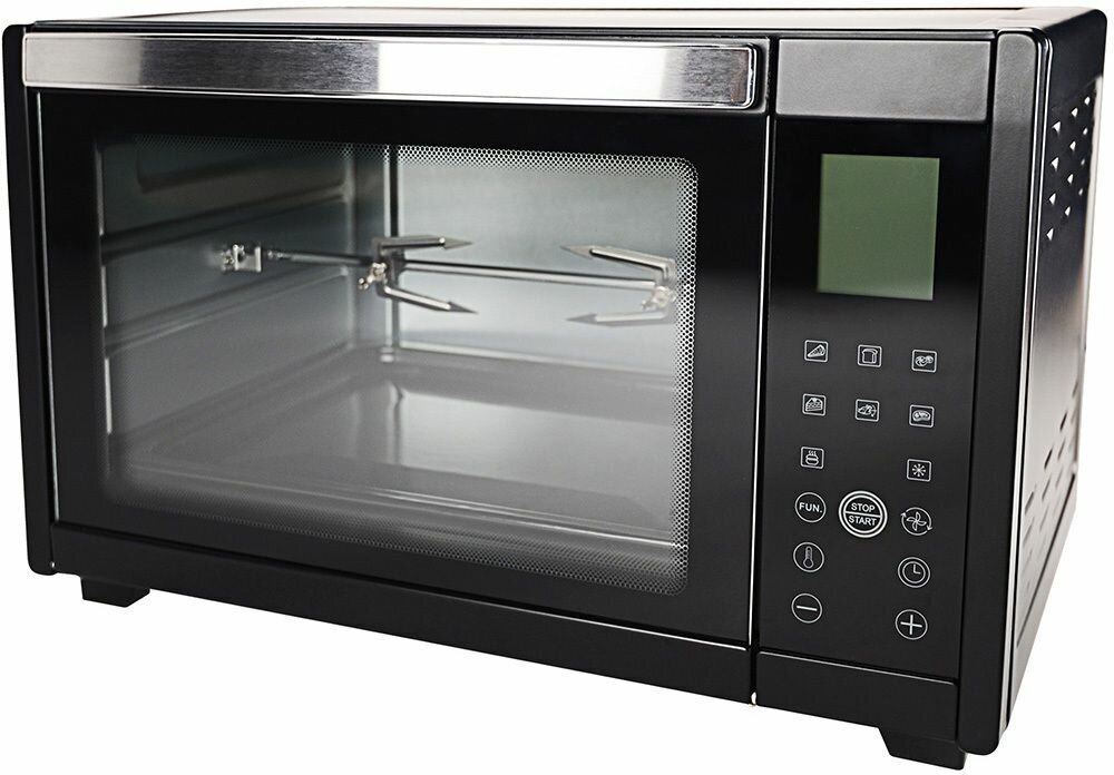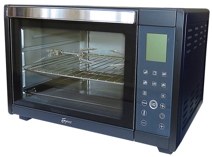 Встроенный гриль позволяет готовить мясо, рыбу и овощи с хрустящей корочкой. Также есть вертел, который вращается вокруг своей оси. На дисплее отображается время и температура внутри печи. Корпус выполнен из металла и пластика, а внутреннее покрытие — из нержавеющей стали. Устройство защищено от перегрева.