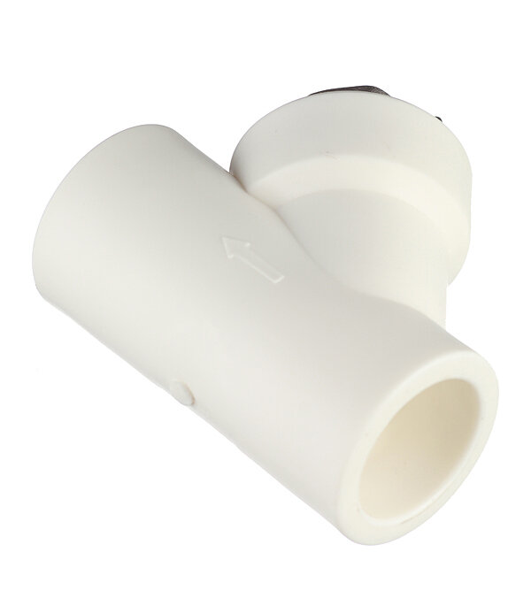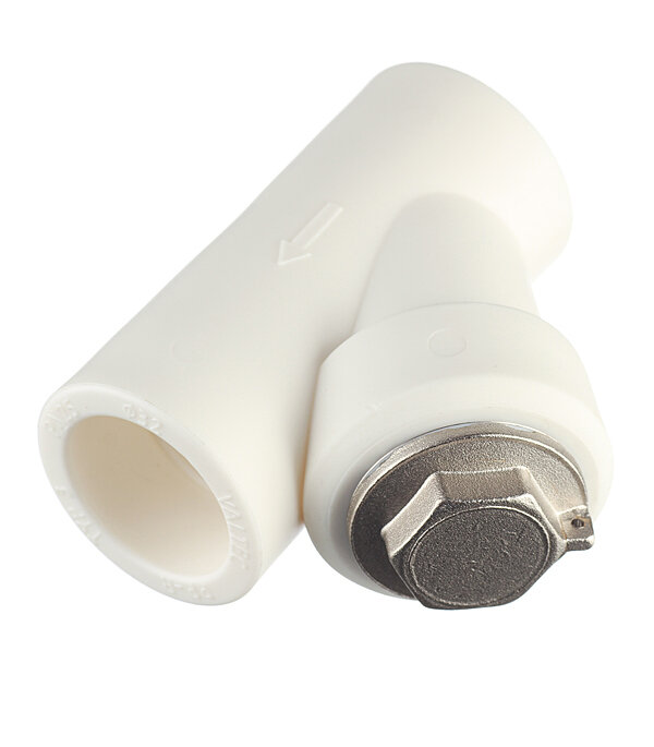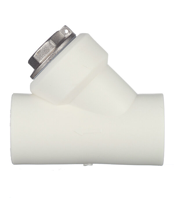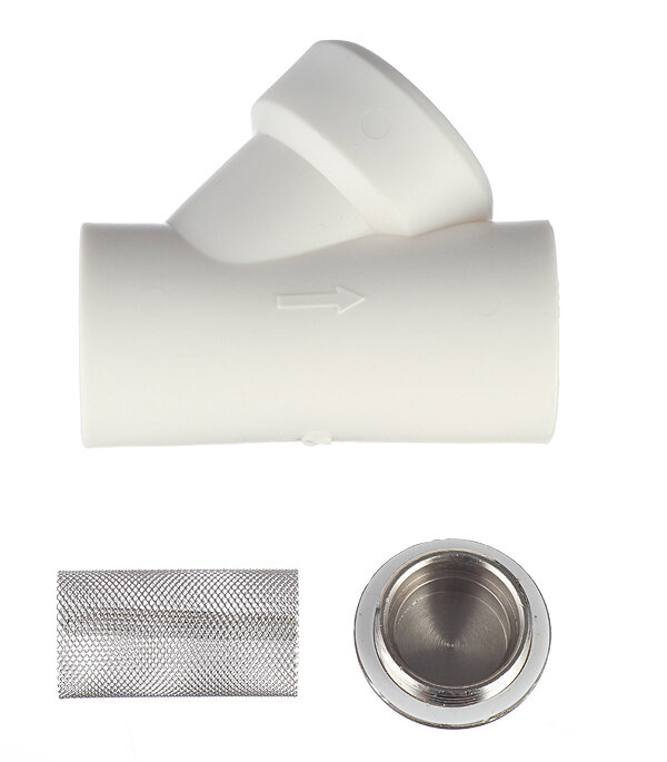 - Фильтр с корпусом из полипропилена и сетчатым элементом из нержавеющей стали марки AISI 304, предназначенный для очистки транспортируемой жидкости от нерастворимых примесей размером от 300 мкм. Используется в составе систем из полипропиленовых труб c рабочей температурой до 90 °С и при номинальном давлении (PN) 25 бар. Пробка и закладная деталь фильтра выполнены из латуни марки CW617N, никелированы, уплотнительная прокладка – из синтетического каучука EPDM. Монтаж фильтра производится методом раструбной сварки. Присоединения – внутреннее/внутреннее.