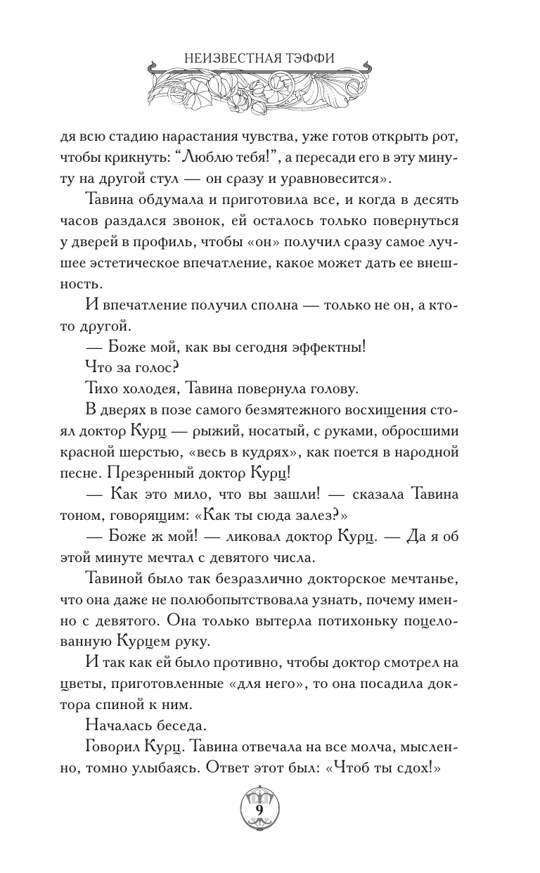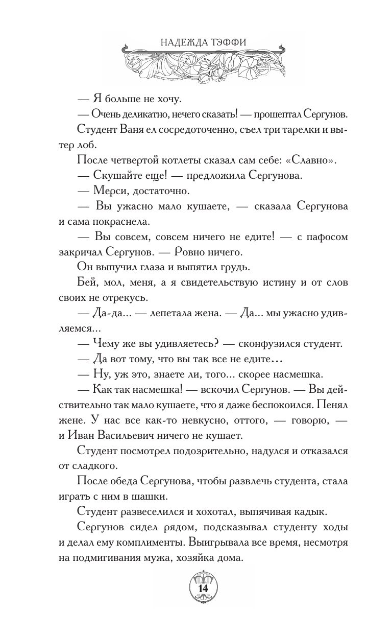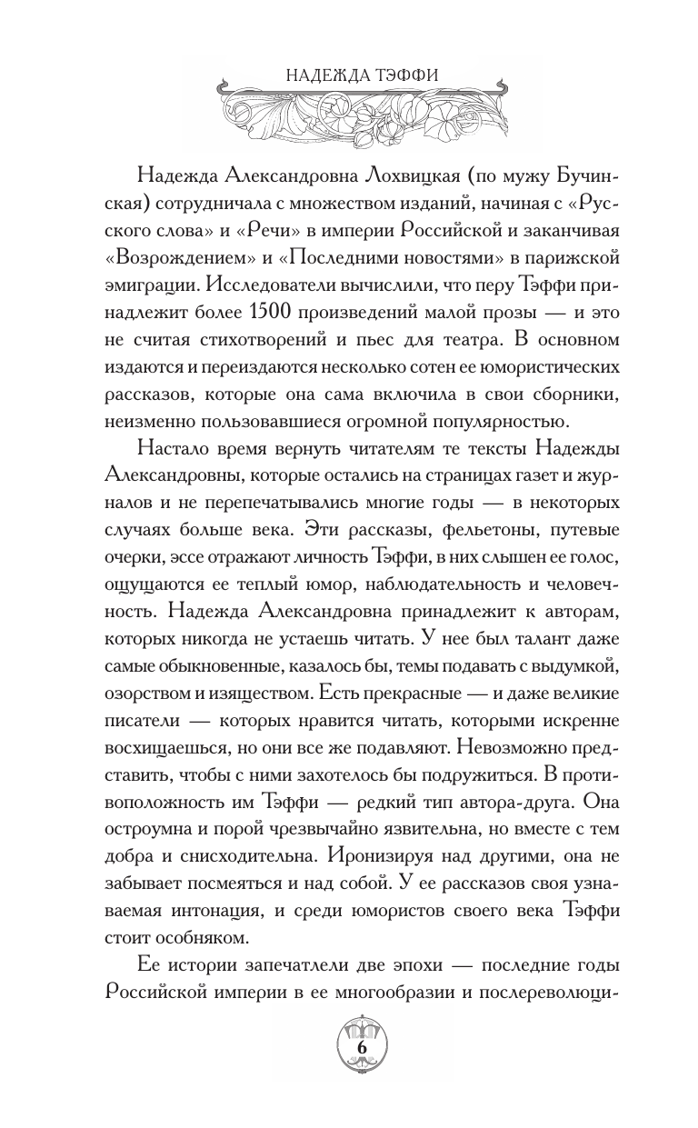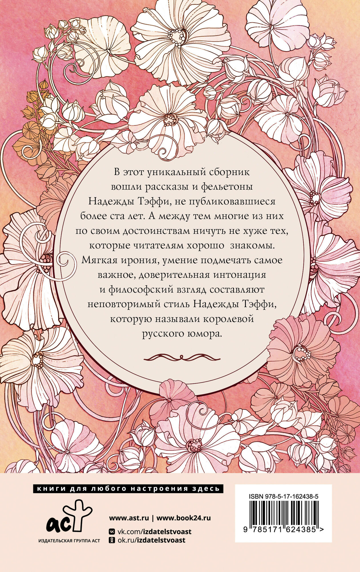 В этот уникальный сборник вошли рассказы и фельетоны Надежды Тэффи, не публиковавшиеся более ста лет. А между тем многие из них по своим достоинствам ничуть не хуже тех, которые читателям хорошо знакомы. Мягкая ирония, умение подмечать самое важное, доверительная интонация и философский взгляд составляют неповторимый стиль Надежды Тэффи, которую называли королевой русского юмора.