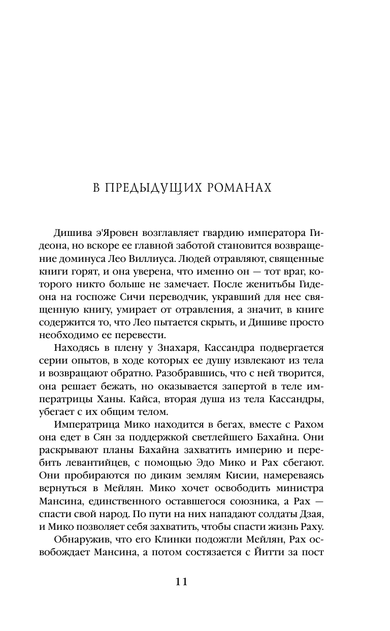 Кисианская империя превратилась в пепел. Мико Ц`ай прикладывает все усилия, чтобы закрепиться на ее руинах. Рах`э Торин потерял всех своих людей. У Кассандры остается все меньше времени, чтобы помешать Лео Виллиусу получить полный контроль над императором Левантии. Альянсы рушатся. Надежды тают. Империя опустела. Но история еще не закончилась.