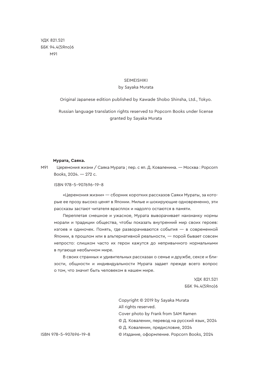 Книга: Церемония жизни (Саяка Мурата); Individuum / Popcorn books, 2019