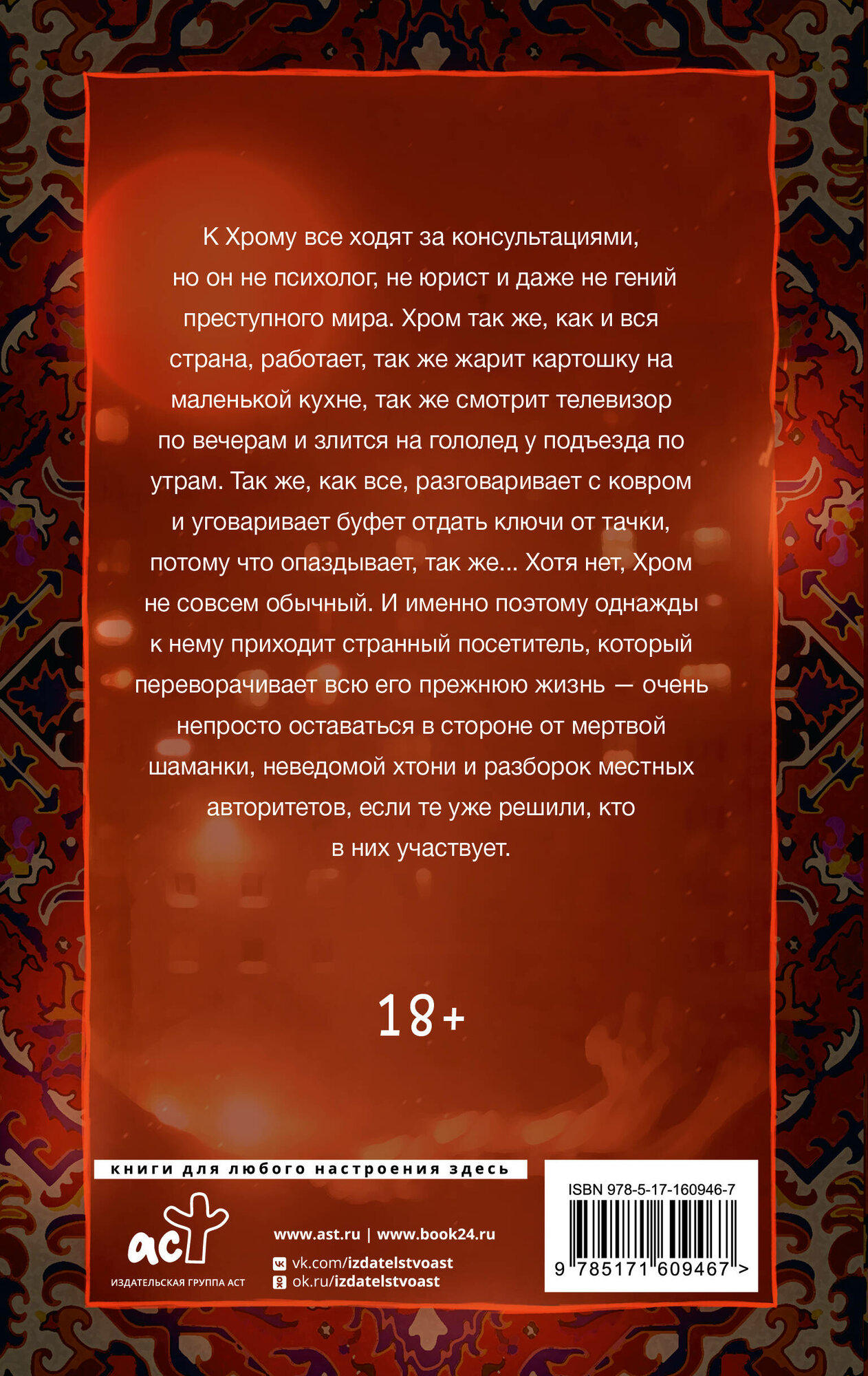 К Хрому все ходят за консультациями, но он не психолог, не юрист и даже не гений преступного мира. Хром так же, как и вся страна, работает, так же жарит картошку намаленькой кухне, так же смотрит телевизор по вечерам и злится на гололед у подъезда по утрам. Так же, как все, разговаривает с ковром и уговаривает буфет отдать ключи от тачки,потому что опаздывает, так же. Хотя нет, Хром не совсем обычный. И именно поэтому однажды к нему приходит странный посетитель, который переворачивает всю его прежнюю жизнь — оченьнепросто оставаться в стороне от мертвой шаманки, неведомой хтони и разборок местных авторитетов, если те уже решили, кто в них участвует.