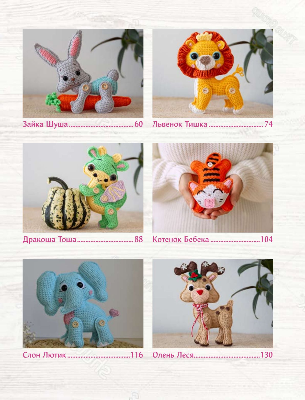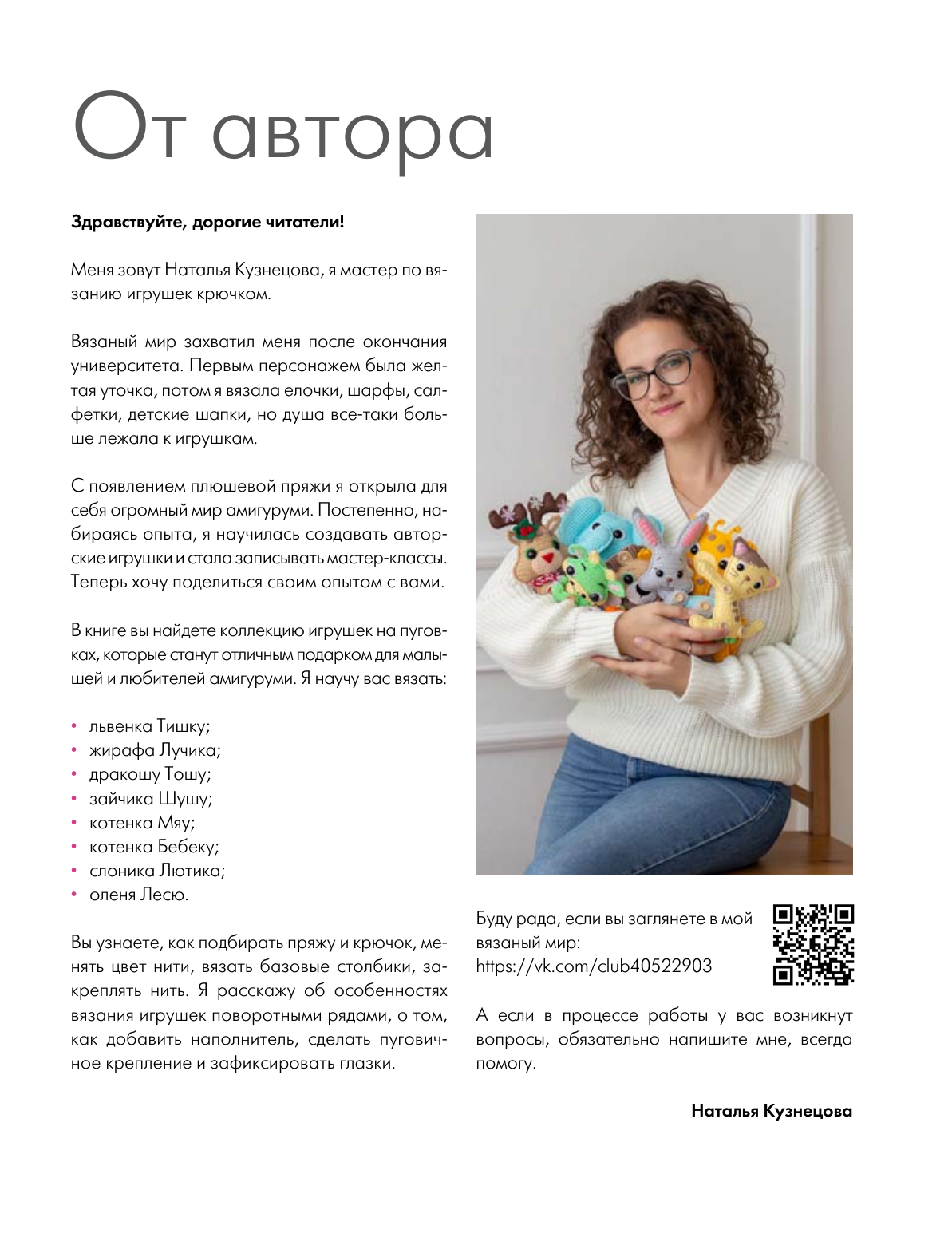 А еще вы узнаете, как вязать поворотными рядами, подбирать пряжу и крючок, менять цвет нити, вязать базовые столбики, закреплять нить, добавлять наполнитель, делать пуговичное крепление и фиксировать глазки.
