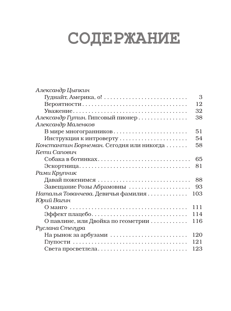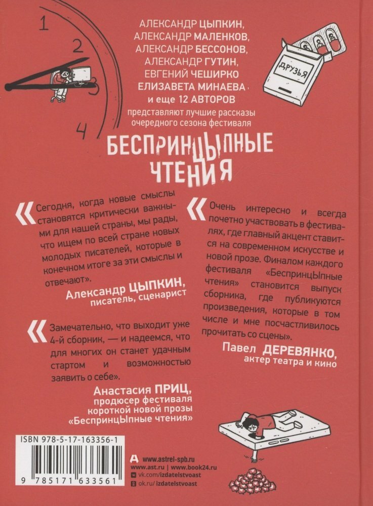 Александр Цыпкин, Александр Маленков, Александр Бессонов, Евгений Чеширко, Елизавета Минаева, Александр Гутин и еще 12 авторов представляют лучшие рассказы очередного сезона фестиваля «БеспринцЫпные чтения»! «Сегодня, когда новые смыслы становятся критически важными для нашей страны, мы рады, что ищем по всей стране новых молодых писателей, которые в конечном итоге за эти смыслы и отвечают». Александр Цыпкин, писатель, сценарист «Очень интересно и всегда почетно участвовать в фестивалях, где главный акцент ставится на современном искусстве и новой прозе. Финалом каждого фестиваля „БеспринцЫпные чтения“ становится выпуск сборника, где публикуются произведения, которые в том числе и мне посчастливилось прочитать со сцены». Павел Деревянко, актер театра и кино «Замечательно, что выходит уже 4-й сборник, — и надеемся, что для многих он станет удачным стартом и возможностью заявить о себе». Анастасия Приц, продюсер фестиваля короткой новой прозы «БеспринцЫпные чтения»