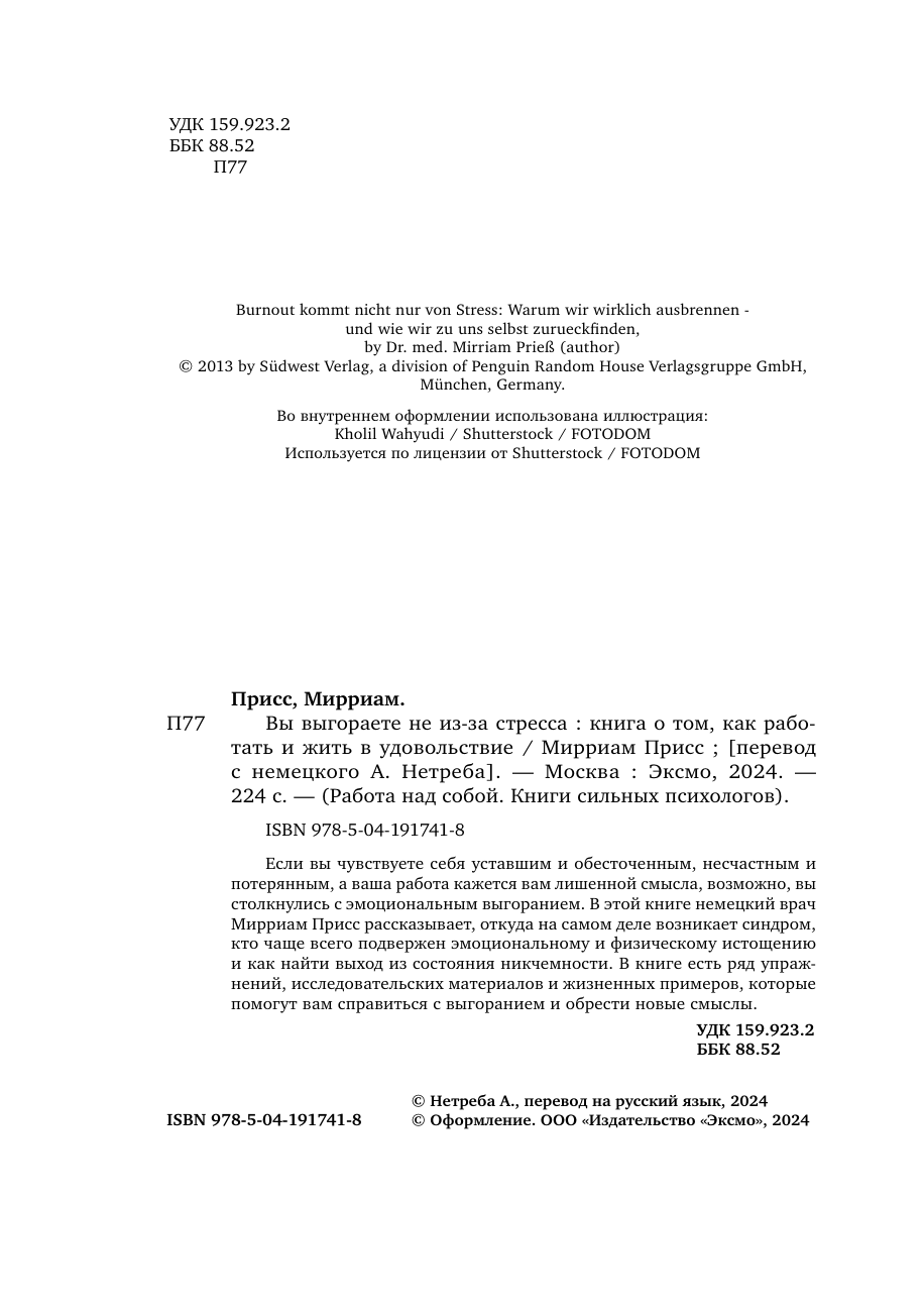 Вы выгораете не из-за стресса. Книга о том как работать и жить в удовольствие (Мирриам Присс); ООО "Издательство "Эксмо", 2024