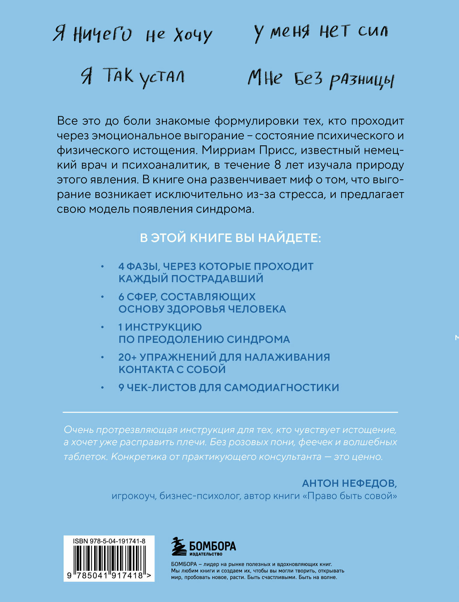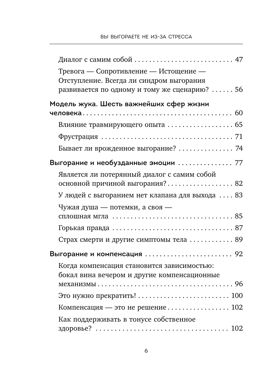 Если вы чувствуете себя уставшим и обесточенным, несчастным и потерянным, а ваша работа кажется вам лишенной смысла, возможно, вы столкнулись с эмоциональным выгоранием. В этой книге немецкий врач Мирриам Присс рассказывает, откуда на самом деле возникает синдром, кто чаще всего подвержен эмоциональному и физическому истощению и как найти выход из состояния никчемности. В книге есть ряд упражнений, исследовательских материалов и жизненных примеров, которые помогут вам справиться с выгоранием и обрести новые смыслы.
