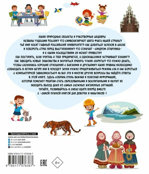 Дорогие родители, наверняка вы делаете всё, чтобы ваши дети росли и здоровыми, и умными, и воспитанными. Представляем вашему вниманию удивительную книгу, которая откроет перед ребятами мир увлекательных и важных знаний, касающихся каждого мальчика и девочку. Это увлекательное и практичное руководство поможет им освоить основные правила безопасности и этикета, подскажет, как быть здоровыми и активными, как справляться с различными жизненными трудностями. Здесь они найдут множество интересных историй, примеров и практических советов, которые помогут детям разобраться в такой важной сфере, как общение: с учителями, одноклассниками, родными. Кроме того, в книге содержится интересная и нужная информация о России, изучить которую должен каждый ребёнок, ведь все мы являемся частью огромной страны.