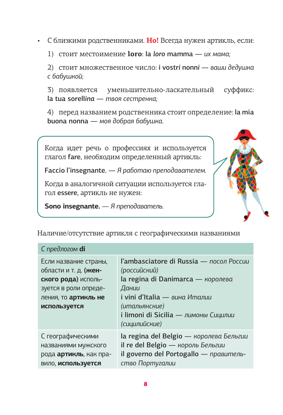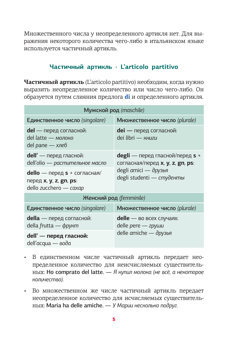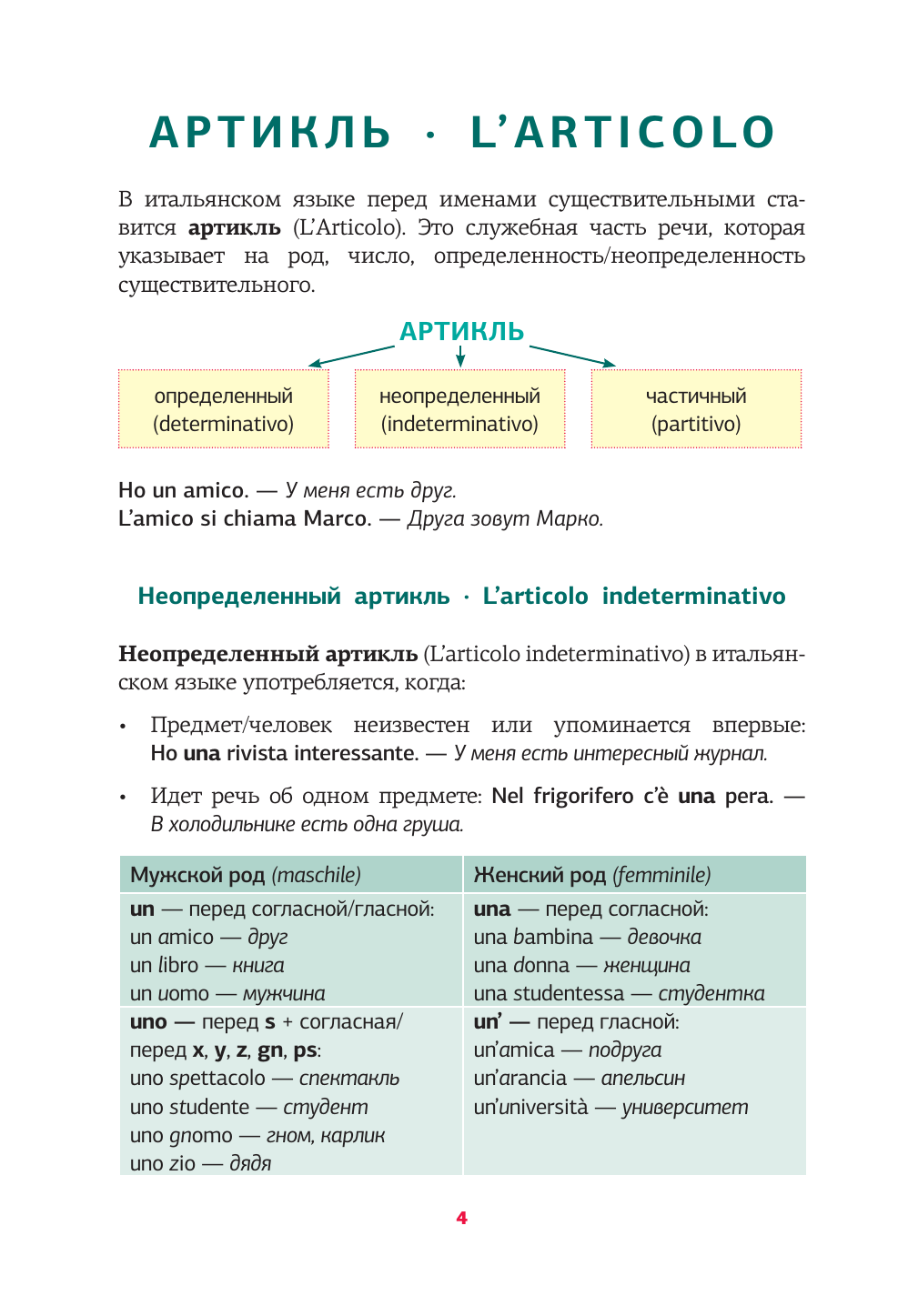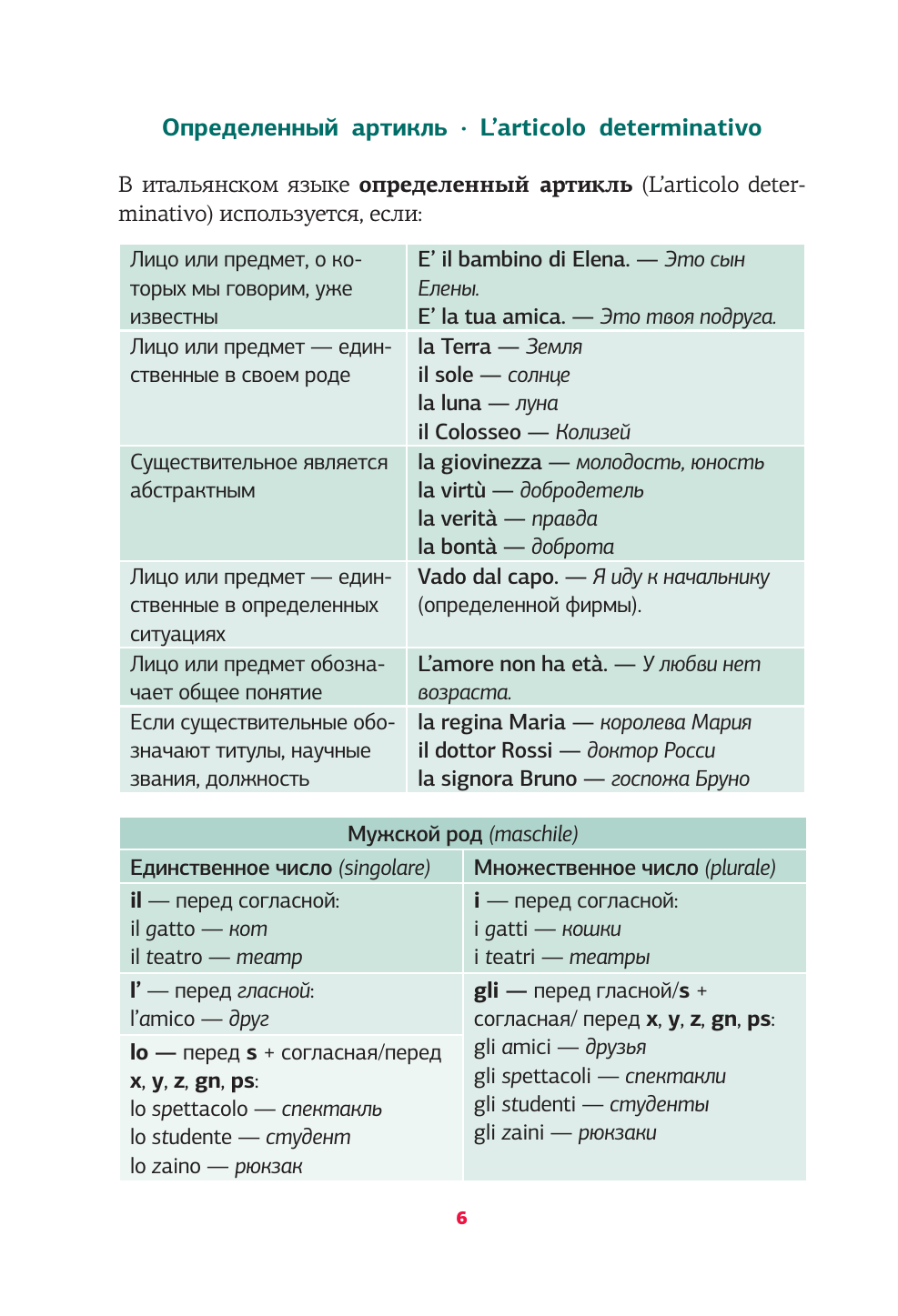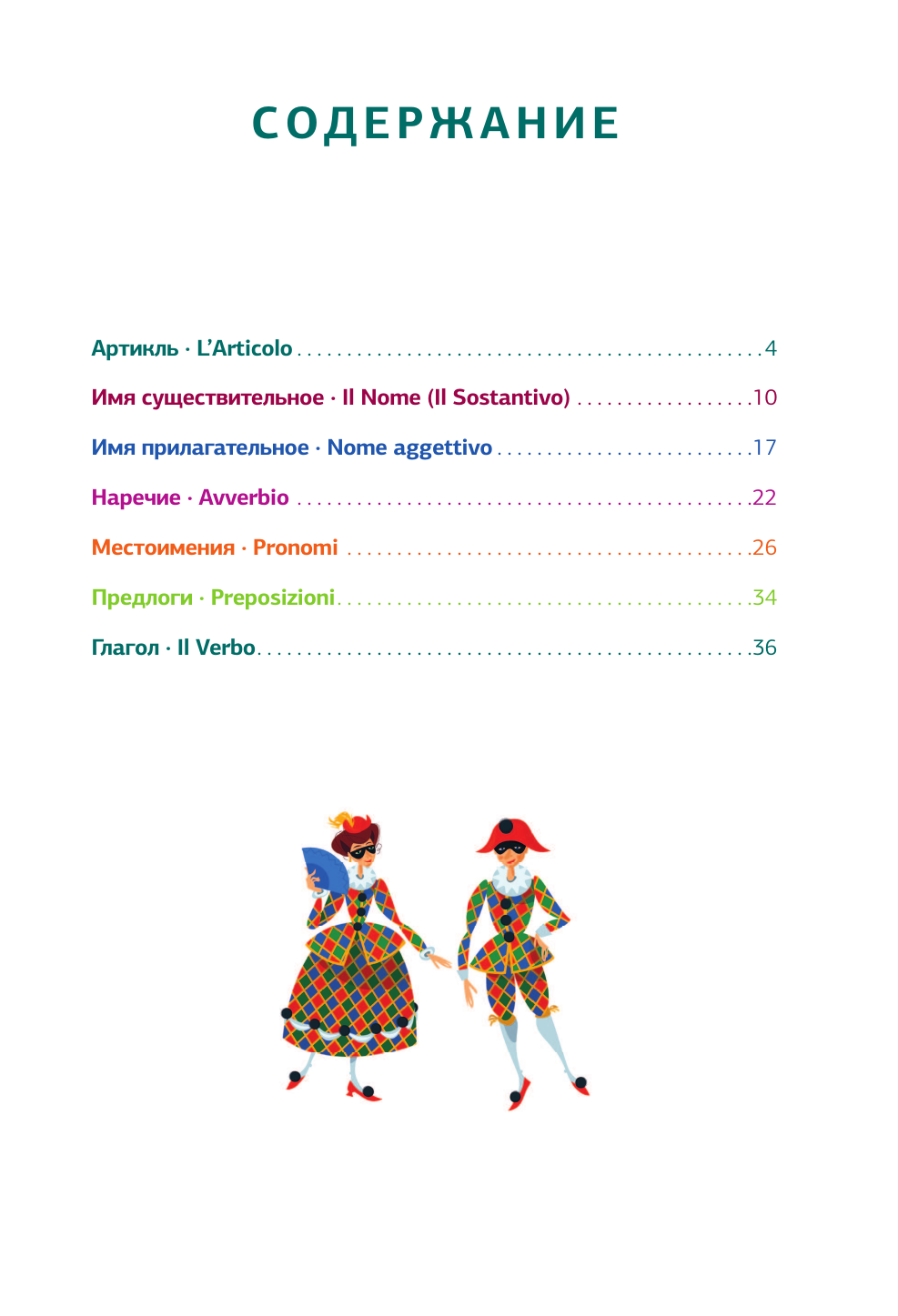 Пособие содержит базовый курс итальянской грамматики. Рассматриваются такие темы, как артикль, род и число существительных, степени сравнения прилагательных и наречий, местоимения, времена глагола. Материал представлен в четких и наглядных схемах и таблицах, что способствует быстрому и качественному усвоению. По пособию можно учить и повторять.