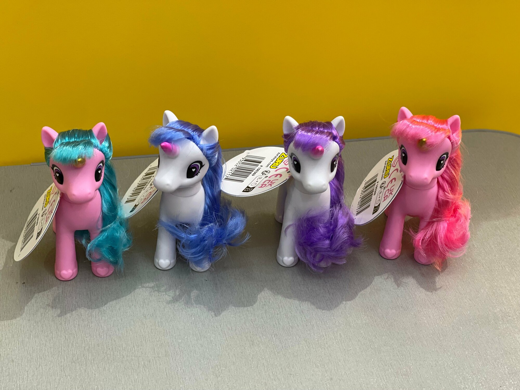 Милый единорожек с подвижной головой и роскошными гривой и хвостом. Материал пластик. В ассортименте 4 расцветки: розовый с розовыми и бирюзовыми волосами, белый с голубыми и фиолетовыми волосами.