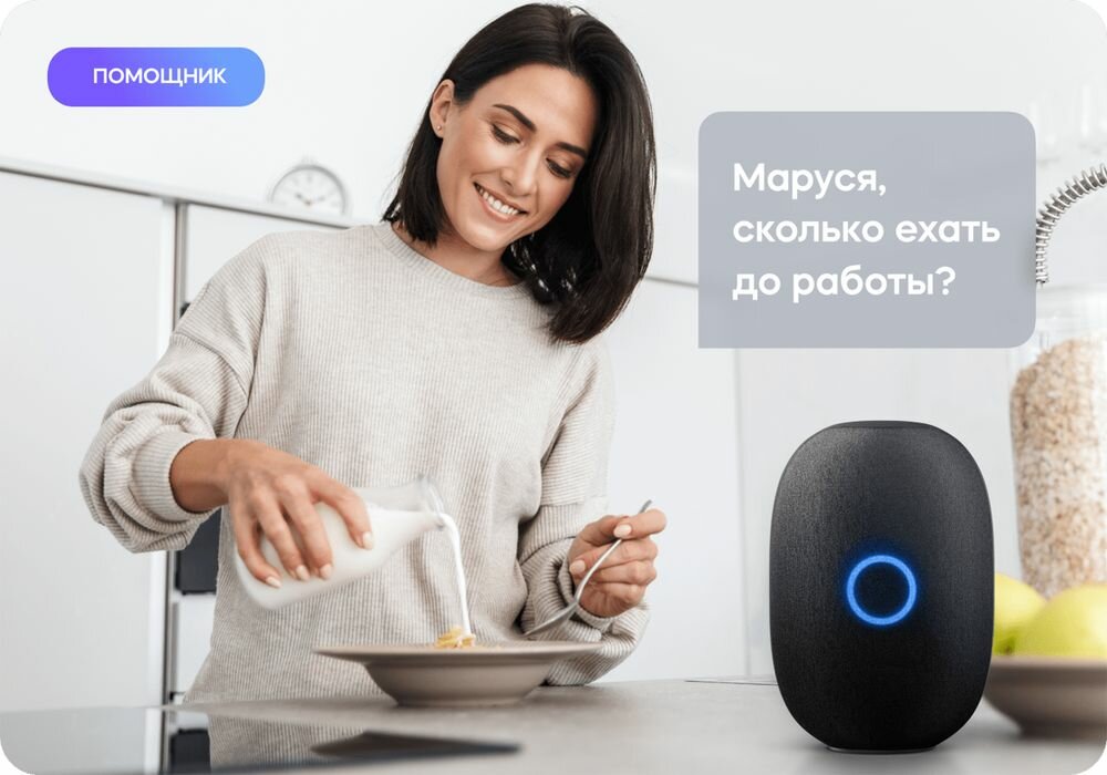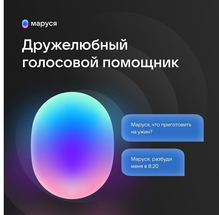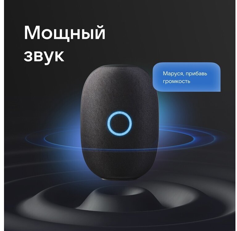 Умная колонка VK выполнена в черном корпусе овальной формы, который покрыт акустической тканью. Внутри находится система с 2 динамиками выходной мощностью 30 Вт. Они обеспечивают чистое и насыщенное звучание без искажений. Шесть цифровых микрофонов с точностью определяют голос. Колонка VK оснащена виртуальным помощником Маруся, которая реагирует на голосовые запросы и команды пользователей. С ее помощью можно включать музыку и другой аудиоконтент, ставить будильник и таймер, получать информацию о погоде и новостях, находить кулинарные рецепты, взаимодействовать с устройствами умного дома.