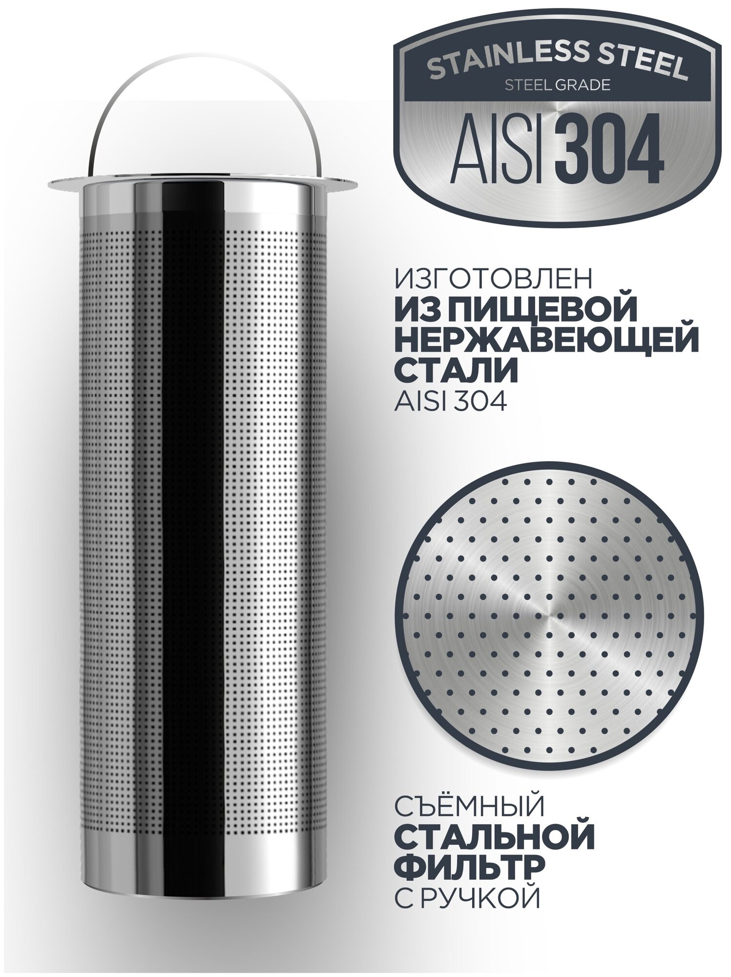 Мелкоячеистый фильтр позволяет заваривать любые фруктовые и травяные чаи, предотвращая попадание в чашку мякоти фруктов и ягод, а также маленьких листочков. Чайник можно мыть в посудомоечной машине.