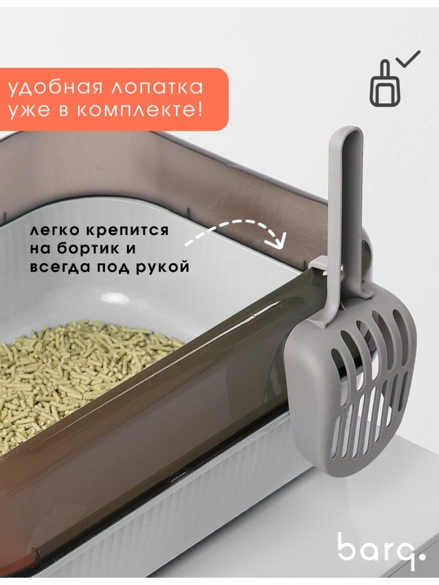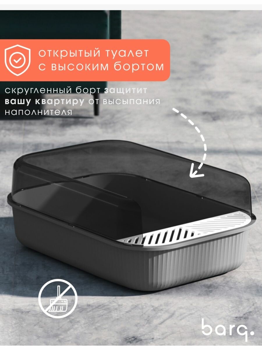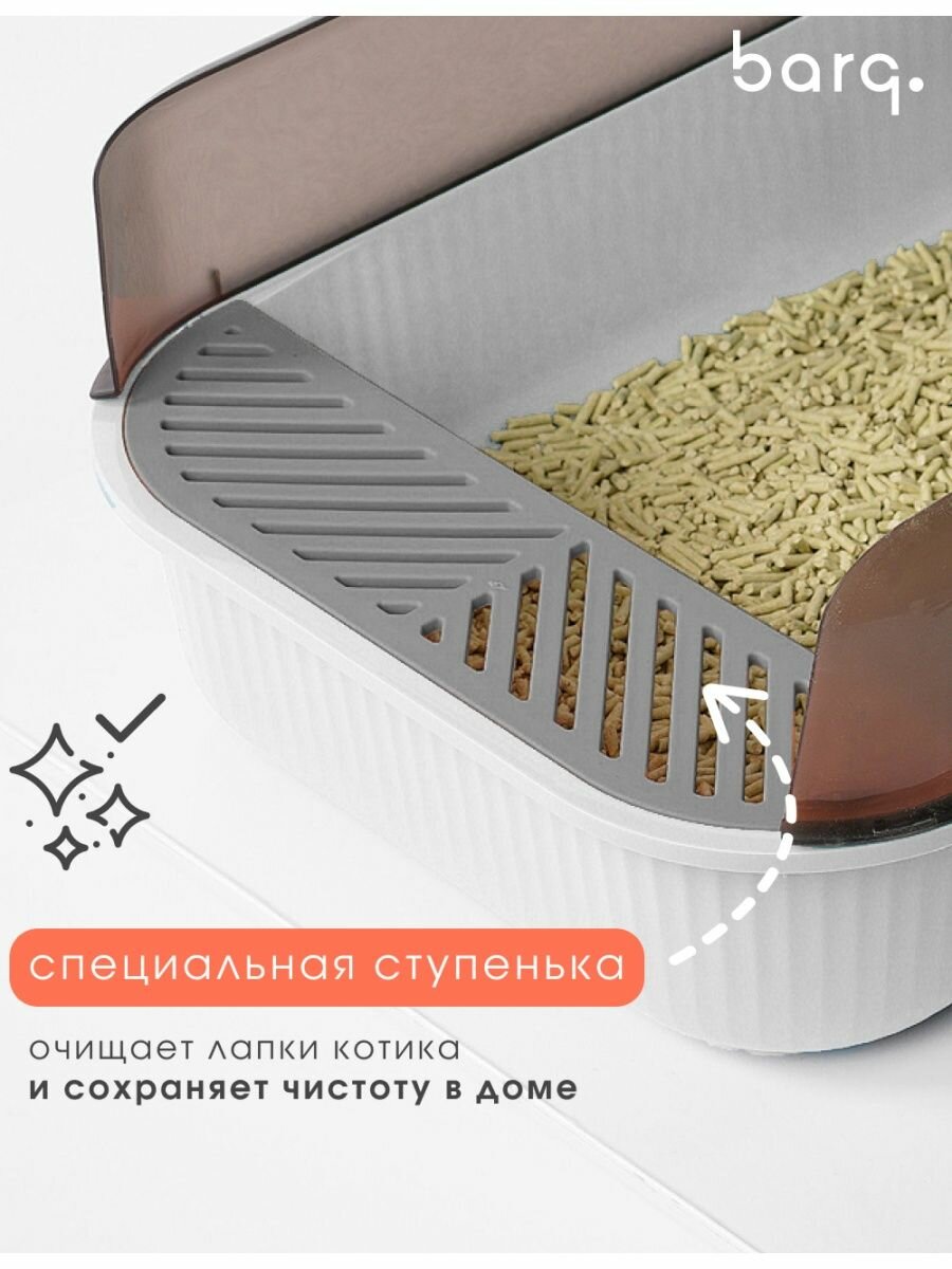 Туалет Sotto — это классический открытый лоток для любимого питомца - кошек. Простая конструкция и стандартный размер проверены временем, это универсальный и всегда удачный вариант. Можно использовать туалeт для кошек разных пород, он будет удобен как для крупного мейн-куна, так и для мелких пород котиков. Такой аксессуар может стать первым лотком для котят, которые только осваивают самостоятельное посещение туалeта. Также это может быть лоток для маленьких собак миниатюрных пород. Открытая модель хорошо вписывается в современный дизайн интерьера, она меньше и компактнее, чем закрытый лoток или домик-лоток для кошек. Благодаря плавным линиям и минималистичному дизайну котиков туалет выглядит современно и стильно. Лотoк для кошек и небольшой собачки с бортом эргономичен и безопасен не только для животных, но и для людей — о закругленные углы трудно зацепиться ногой. Несмотря на простоту, лотоk для кошек большой и функциональный. В модели предусмотрены высокие борта, которые не допускают высыпание содержимого наружу. С торцевой стороны есть небольшая сетчатая подставка, наступая на которую коты или собаки мелких пород очищают лапки от остатков наполнителя. Удобный лоток с высоким бортом и сеткой укомплектован специальной лопаткой, она закреплена с внешней стороны туалета для кошки. В лоток для собак мелких пород или кошек можно насыпать разные виды наполнителя: песок, прессованные опилки, гранулы, шарики силикагеля. Кошачий туалeт с сеткой выполнен из био-пластика. Это безопасный и практичный материал, удобный в обслуживании. Пластиковый глубокий лотoк для кoшек просто мыть и дезинфицировать, он не впитывает неприятные запахи. Минималистичный лoток для котика с сеткой Sotto бренда BARQ выглядит необычно за счет оригинального цветового исполнения. Элементы кошачьего туалeта (лоток, борта, сетка) выполнены в контрастных насыщенных оттенках природной гаммы, поэтому он смотрится ярко и стильно. Аксессуар станет интересным акцентом в дизайне вашей ванной комнаты.