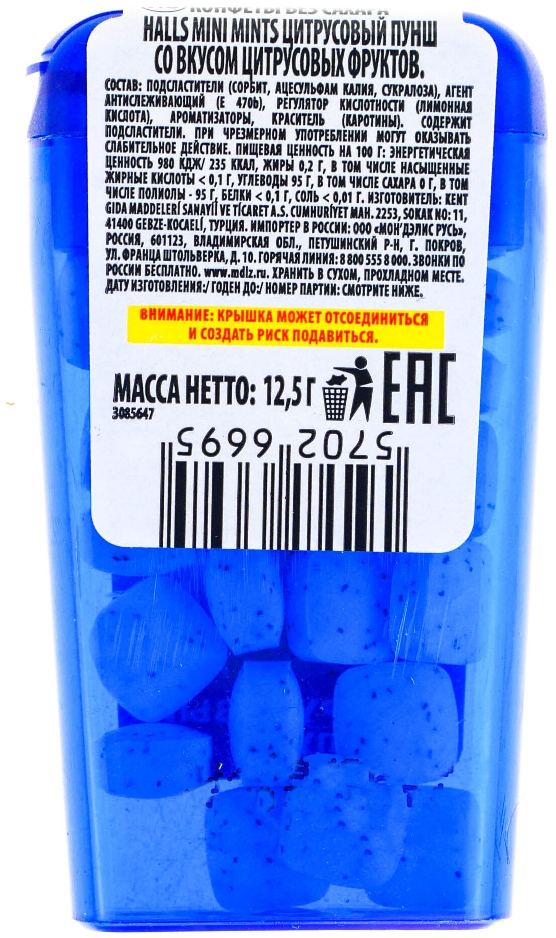 Halls Mini Mints цитрусовый пунш со вкусом цитрусовых фруктов без сахара. Отлично освежает. Содержит подсластители, при чрезмерном употреблении может оказывать слабительное действие.
