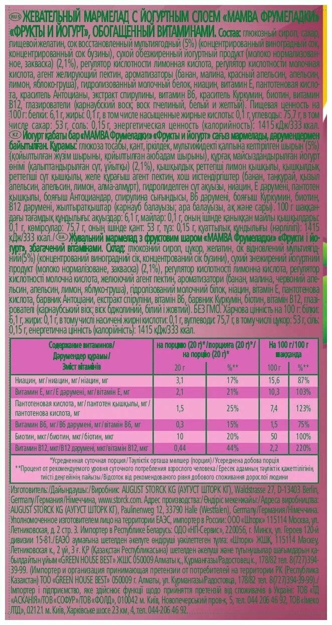 | Состав | Глюкозный сироп, сахар, пищевой желатин, сок восстановленный мультиягодный (5%) (концентрированный виноградный сок, концентрированный сок бузины), сухой обезжиренный йогурт (молоко нормализованное, закваска) (2,1%), регулятор кислотности лимонная кислота, регулятор кислотности молочная кислота, агент желирующий пектин, ароматизаторы, гидролизованный молочный белок, ниацин (никотинамид), витамин Е (DL-альфа-токоферола ацетат), пантотеновая кислота (D-пантотенат кальция), концентрат черной моркови, концентрат спирулины, витамин В6 (пиридоксин гидрохлорид), краситель куркумин, биотин (D-биотин), витамин В12 (цианокобаламин), глазирователи (воск карнаубский, воск пчелиный, белый и желтый). |