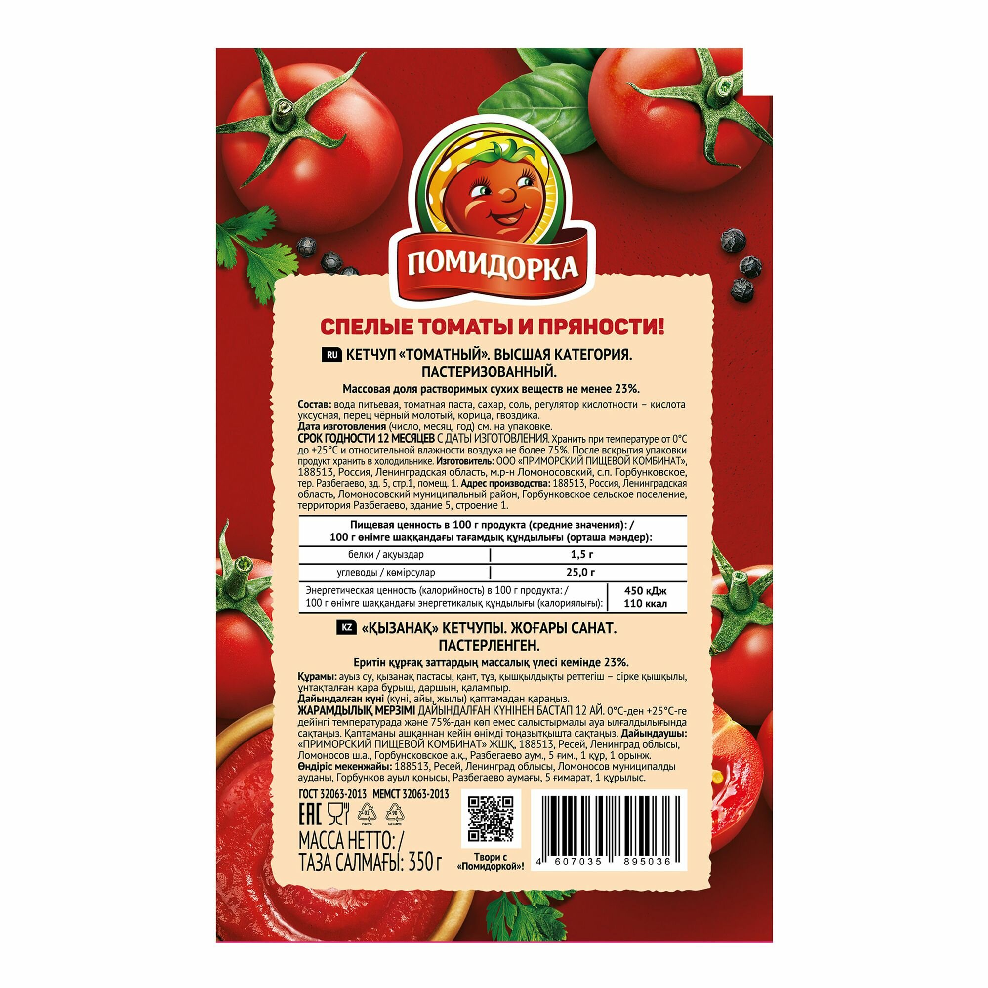Кетчуп ПОМИДОРКА изготавливается на одной из лучших и современных производственных площадок в России, только натуральные ингредиенты, нет загустителей, стабилизаторов, ароматизаторов и консервантов. Высшей категории.
