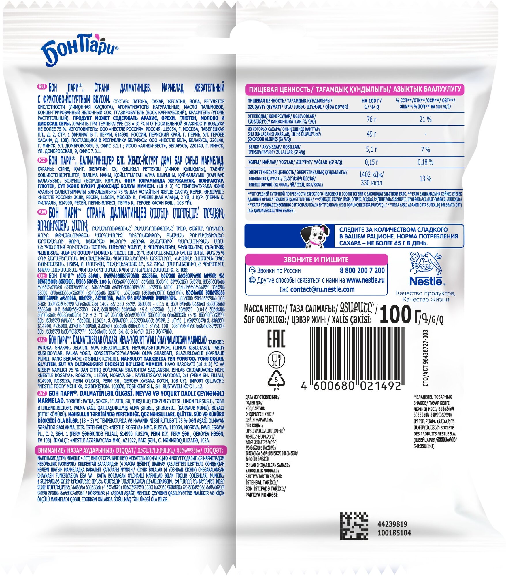 Мармелад Бон Пари Страна далматинцев производится без добавления искусственных красителей. В производстве используется концентрированный фруктовый сок.*На основании данных NielsenIQ RMS для категории Упакованные не шоколадные