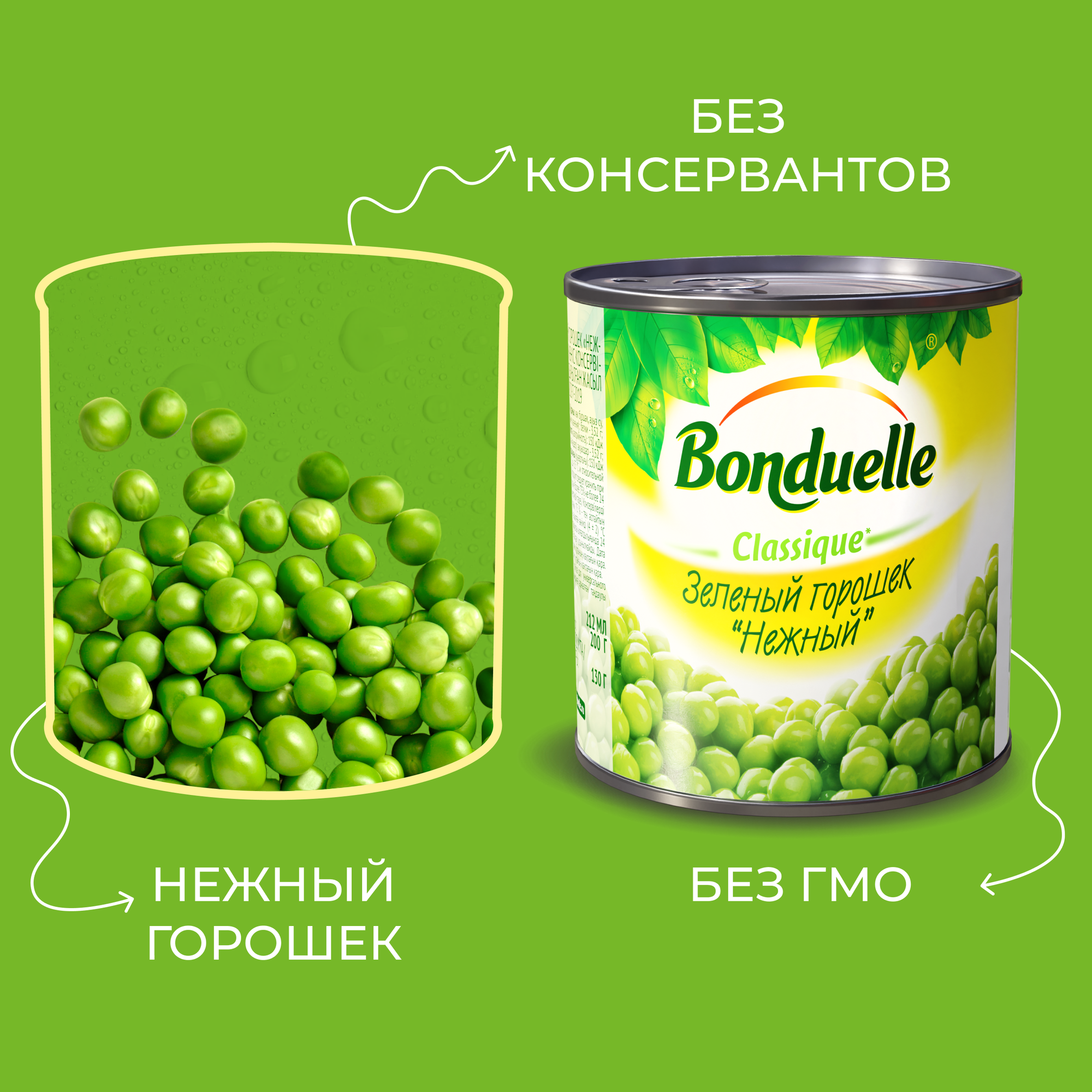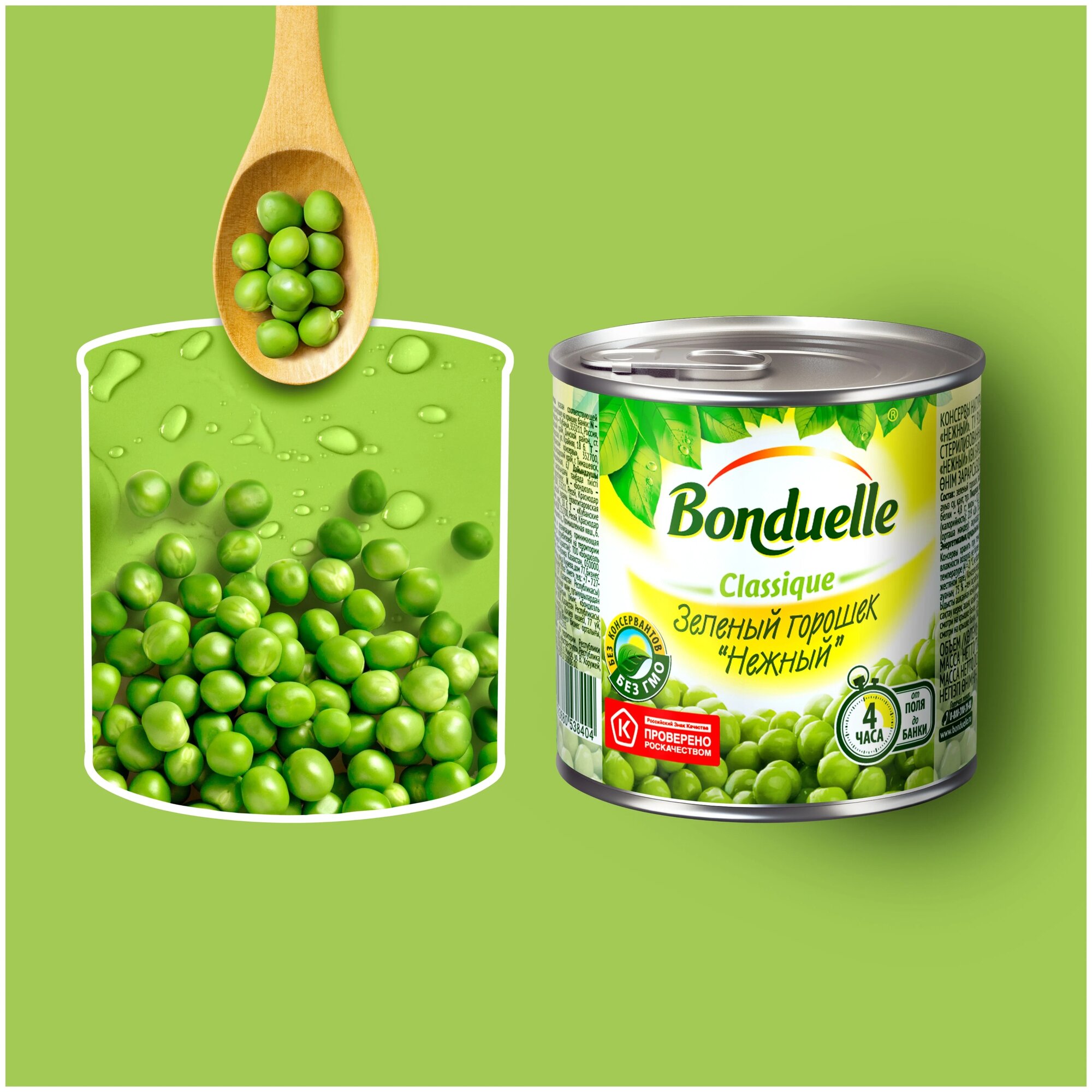 Нежнейший и сладкий зеленый горошек непревзойденного качества тщательно отбирается, прежде чем попасть в банку. Только у Bonduelle процесс от сбора с грядки до упаковки проходит всего за 4 часа, поэтому на вашем столе всегда самый лучший горошек мозговых сортов, в котором содержится меньше крахмала, больше витаминов и яркого вкуса.